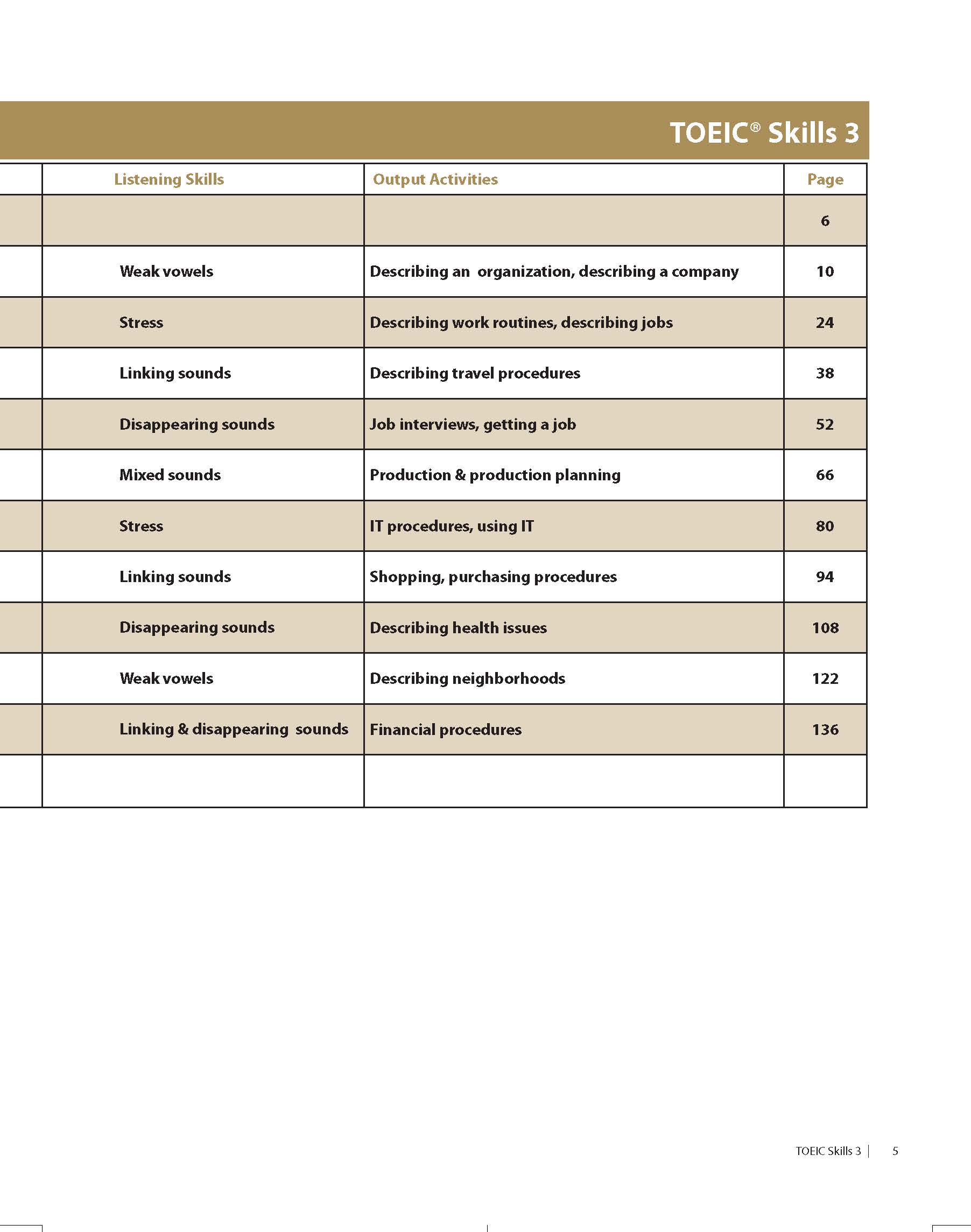 NEW TOEIC Skills là một bộ giáo trình 3 cấp độ được thiết kế để giúp học viên cải thiện điểm thi TOEIC. Bộ sách NEW bao hàm lượng kiến thức cho các bài thi TOEIC mới ra vào tháng 5/2016. TOEIC Skills 1 dành cho học viên học cho cấp độ 300-450 TOEIC Skills 2 dành cho học viên học cho cấp độ 450-600 TOEIC Skills 3 dành cho học viên học cho cấp độ 600-750 Bộ sách có tính năng Focus on the test (Tập trung vào bài thi) và Focus on the language (Tập trung vào ngôn ngữ). Học viên được luyện tập trong mỗi phần của bài kiểm tra của mỗi đơn vị bài học. Ngoài việc tập trung vào bài kiểm tra, phần tập trung vào ngôn ngữ giúp học viên rèn luyện kĩ năng cần thiết để làm tốt các bài kiểm tra TOEIC.