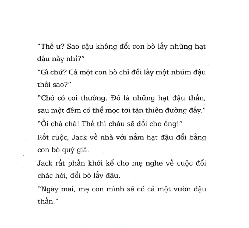 Mua tại TiktokNgày Xửa Ngày Xưa - Jack Và Cây Đậu Thần (Tái Bản) Giới thiệu sách Bộ truyện “Cổ tích Ngày xửa ngày xưa” tái hiện những câu chuyện cổ tích truyền thống với hình vẽ đặc sắc và sống động. Cuốn sách không chỉ khắc họa những nàng công chúa, chàng hoàng tử của thế hệ mới một cách vui tươi và mạnh mẽ hơn, mà còn kết hợp giữa việc kể chuyện và các trò chơi tương tác, giúp trẻ nhỏ học hỏi và giải trí đồng thời. Đối tượng sử dụng