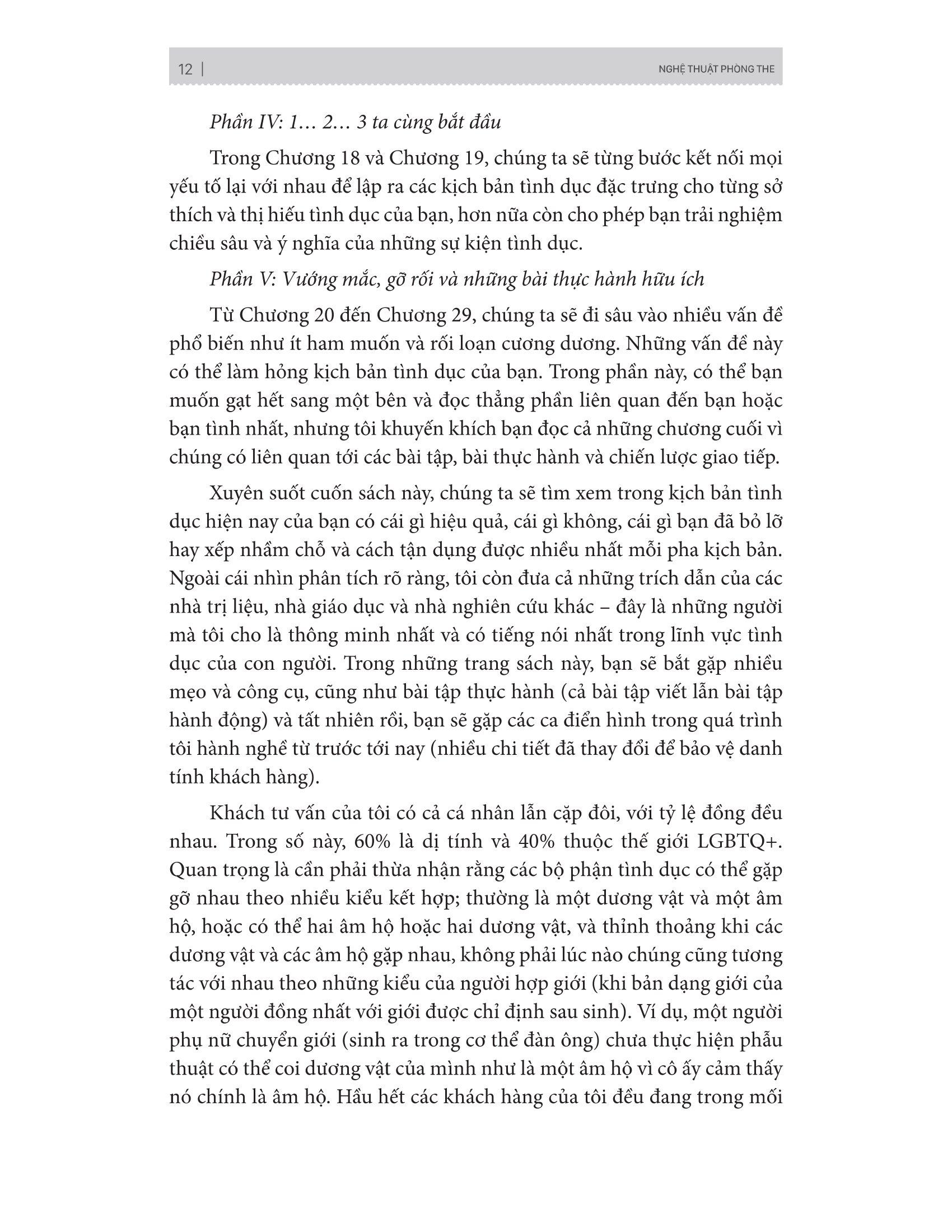 Trong xuyên suốt cuốn sách này, bạn có thể khám phá tận hang cùng ngõ hẻm của vùng đất “mây mưa”, những đề tài gợi tình và những “bí kíp” tạo hưng phẩn chỉ bằng những điểm chạm. Bài tập thực hành tại nhà dưới dạng bài tự suy ngẫm, kích thích tâm sinh lý và rèn luyện hành vi sẽ giúp bạn nâng cao được phần năng khiếu; Thế nhưng còn phần đam mê, thực hành – Đó lại là tuỳ vào bạn!