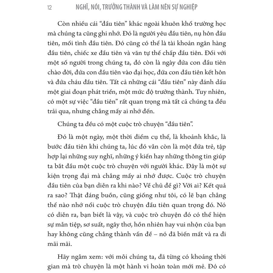 Cuốn sách “Nghĩ, nói, trưởng thành và làm nên sự nghiệp” là một gợi ý tươi mới và tích cực giúp bạn khai thác sức mạnh của những cuộc trò chuyện, đưa những cuộc trò chuyện vượt ra khỏi khuôn khổ “chém gió” thông thường và đi sâu vào cốt lõi của công việc, cuộc sống. Bạn hãy trở nên mạnh dạn hơn để bắt đầu những cuộc trò chuyện, đặt câu hỏi và bắt đầu khai mở hiểu biết của bản thân.