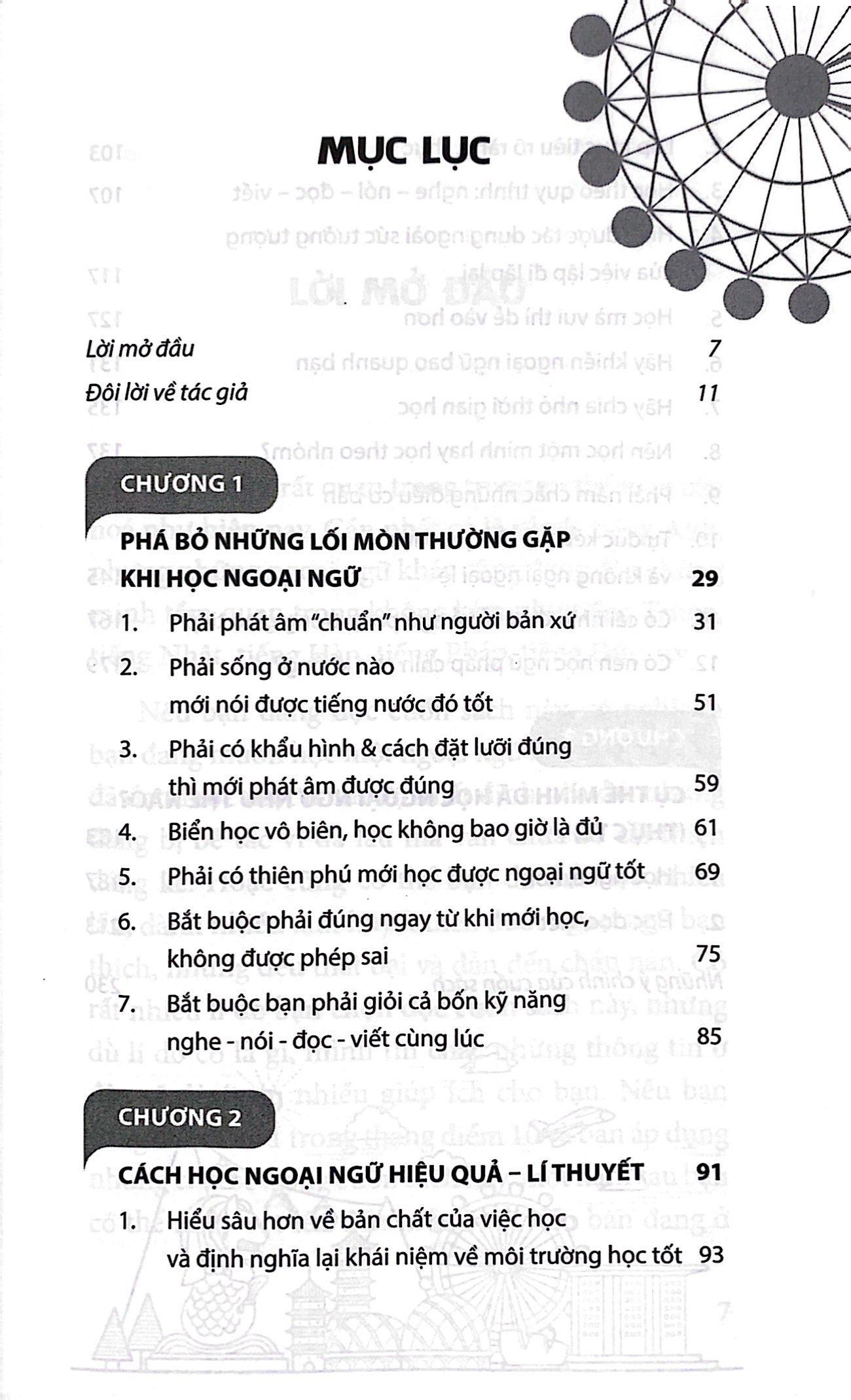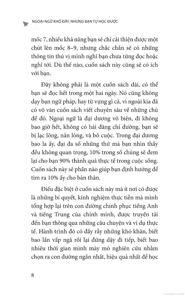 Đây không phải là một cuốn sách dài, nên có thể bạn sẽ đọc hết trong một hai ngày. Nó cũng không dạy bạn ngữ pháp, hay từ vựng gì cả, vì ngoài kia đã có vô vàn cuốn sách viết chuyên sâu về những chủ đề đó. Ngoại ngữ là đại dương vô biên, đi không bao giờ hết, không có hải đăng chỉ đường, bạn sẽ bị lạc lõng, nản lòng, và bỏ cuộc. Trong đại dương bao la ấy, đại đa số những thứ mà bạn nhìn thấy đều không quan trọng, 10% trong số chúng sẽ đem lại cho bạn 90% thành quả thực tế trong cuộc sống. Cuốn sách này sẽ phần nào giúp bạn định hướng để tìm ra 10% ấy cho m.ình.