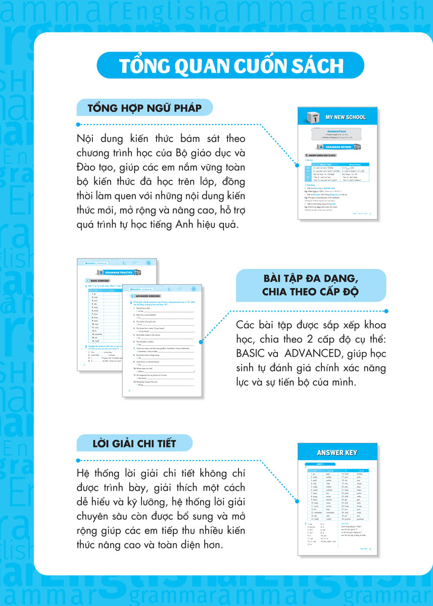 - Tổng hợp đầy đủ, rõ ràng kiến thức ngữ pháp bám sát theo chương trình học - Nội dung kiến thức bám sát theo chương trình học của Bộ giáo dục và Đào tạo, giúp các em nắm vững toàn bộ kiến thức đã học trên lớp, đồng thời làm quen với những nội dung kiến thức mới, mửo rộng và nâng cao, hỗ trợ quá trình tự học tiếng anh hiệu quả.