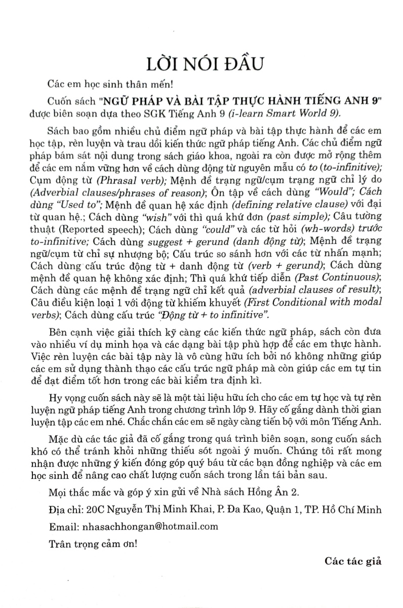 Cuốn sách Ngữ Pháp Và Bài Tập Thực Hành Tiếng Anh 9 được biên soạn dựa theo SGK Tiếng Anh 9 (i-learn Smart World 9).
