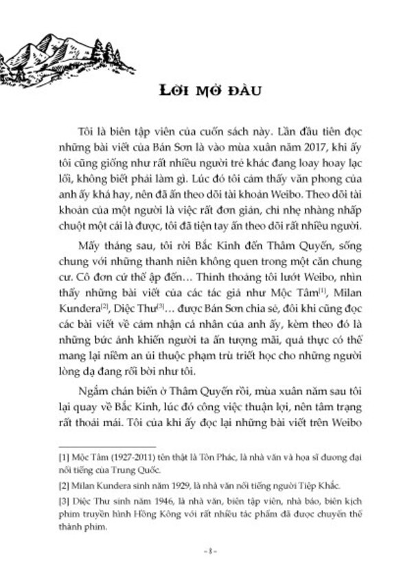 Tác giả Bán Sơn ghi lại những trải nghiệm cuộc sống từ đô thị náo nhiệt đến núi Nga Mi yên tĩnh, từ bối rối và cô đơn đến tiêu hóa nỗi cô đơn, đạt được sự bình tĩnh, tìm được mục đích ban đầu và đạt được trí tuệ.