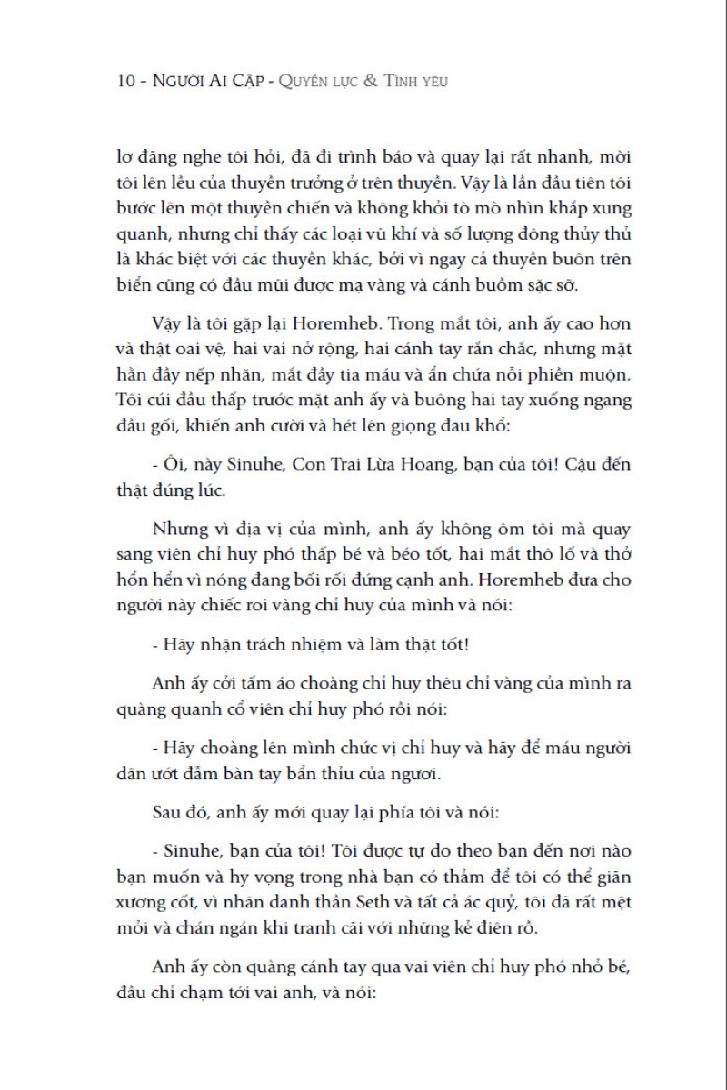 Khép lại những trang sách, bên cạnh những cảm xúc, suy tư lắng đọng về tình yêu, tình bạn, tình người, mỗi người đọc chiêm nghiệm ra những quan điểm nhân sinh cho riêng mình. Chúng ta cũng sẽ nhận ra rằng bản chất con người vẫn luôn không-hoàn-hảo dù ở bất kỳ thời đại nào. Là tiểu thuyết lịch sử có tính chính xác cao, “Người Ai Cập - Quyền lực và tình yêu” qua ngôn ngữ sống động của Mika Waltari giúp độc giả trải nghiệm những phong tục, tập quán, văn hóa, tín ngưỡng tôn giác, kỹ thuật y tế, chính trị và xã hội của Ai Cập cổ đại và các vùng lân cận.
