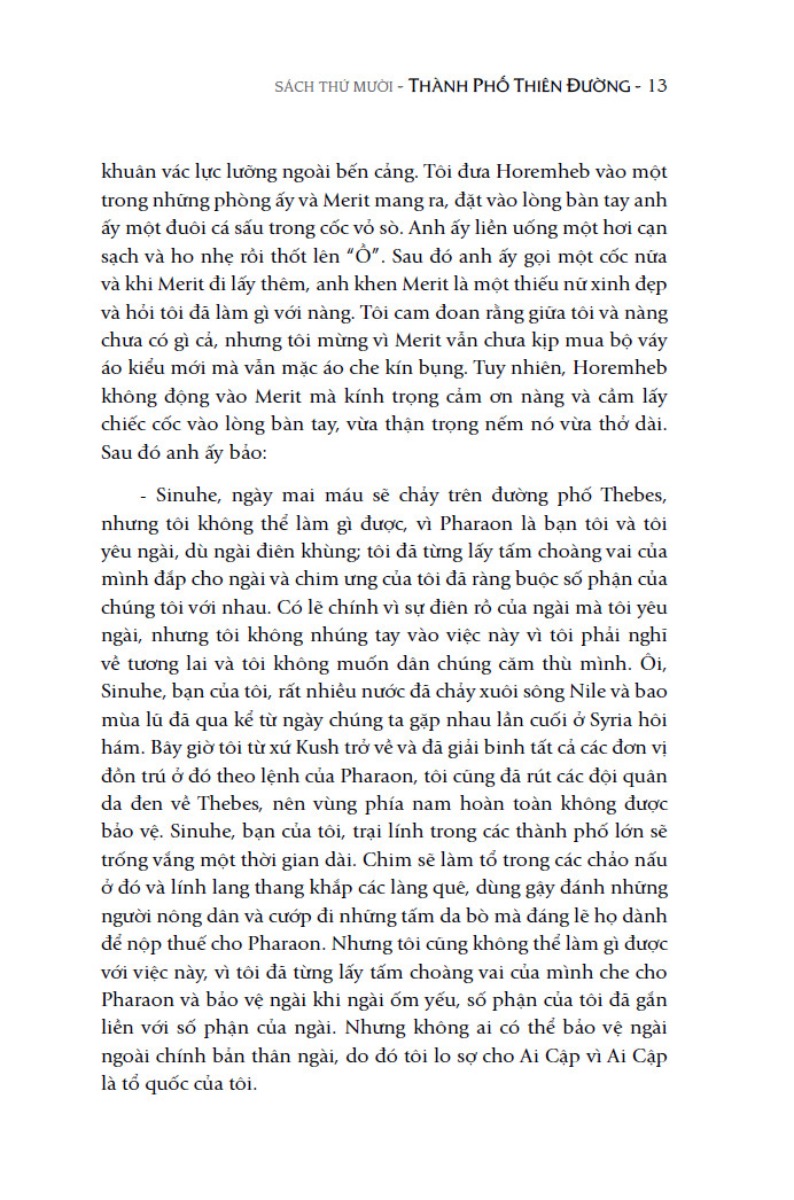 Thất vọng trước số phận, Sinuhe viết 15 chương sách kể lại những trải nghiệm và những sự kiện lịch sử mà mình chứng kiến, với đủ tất cả các gia vị của cuộc đời từ hạnh phúc, vinh quang đến khốn khổ, cô đơn.
