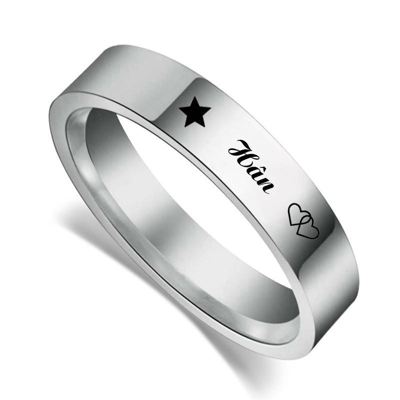 Nhẫn inox theo tên được thiết kế kiểu bản tinh xảo xinh xắn được khắc laser công nghệ hiện đại bật nhất hiện nay với nội dung tên, họa tiết vô cùng đáng yêu. Nhẫn