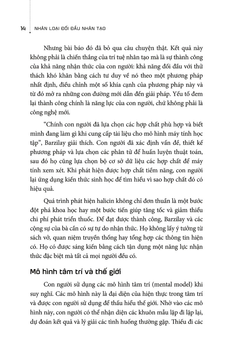 Nhân Loại Đối Đầu Nhân Tạo Lợi thế của con người trong thời đại công nghệ     Sức mạnh của con người nằm ở tâm trí     Mỗi năm, trên thế giới có hơn 700.000 người tử vong do các bệnh truyền nhiễm mà việc ch.ữa tr.ị bằng thuốc kháng sinh không còn hiệu quả. Một số vi khuẩn đã trở nên kháng thuốc. Số ca tử vong đang gia tăng nhanh chóng. Nếu không tìm được giải pháp thì con số sẽ tăng lên tới mười triệu người mỗi năm, tức là trung bình ba giây lại có một người chết. Quy mô thảm họa sẽ vượt xa đại dịch Covid-19. Chính xã hội của chúng ta đã gây ra vấn nạn này. Thuốc kháng sinh mất hiệu quả do bị lạm dụng: Vi khuẩn đã trở thành siêu vi khuẩn nhờ vào loại thuốc từng được dùng để tiêu diệt chúng.     Ngày nay, chúng ta xem thuốc kháng sinh là điều hiển nhiên, hầu hết các thủ thuật y tế như mổ lấy thai, phẫu thuật thẩm mỹ và hóa trị đều phụ thuộc vào thuốc kháng sinh. Nếu loại thuốc này mất hiệu quả thì bệnh nhân sẽ phải chịu rủi ro rất lớn khi ch.ữa tr.ị. Hầu hết các loại kháng sinh có thành phần tương tự nhau đều đã được thử nghiệm và vi khuẩn cũng nhanh chóng kháng lại các thuốc kháng sinh mới có cấu trúc quá giống với thuốc cũ.     Công trình phát hiện ra một loại “siêu thuốc” để trị “siêu vi khuẩn” trở thành tin nóng trên toàn thế giới. Báo chí ca ngợi đây là sự ưu việt của máy móc so với con người, giống như thời khắc mà tivi “giết chết” đài phát thanh. Trên trang nhất của tạp chí Financial Times chạy dòng tít lớn “Trí tuệ nhân tạo khám phá ra loại kháng sinh đều trị các bệnh truyền nhiễm đã lờn thuốc”.     Nhưng bài báo đó đã bỏ qua câu chuyện thật. Kết quả này không phải là chiến thắng của trí tuệ nhân tạo mà là sự thành công của khả năng nhận thức của con người: khả năng đối đầu với thử thách khó khăn bằng cách tư duy về nó theo một phương pháp nhất định, điều chỉnh một số khía cạnh của phương pháp này và từ đó mở ra những con đường mới dẫn đến giải pháp. Yếu tố đem lại thành công chính là năng lực của con người, chứ không phải là công nghệ mới.     Nhân loại đối đầu nhân tạo - Lợi thế của con người trong thời đại công nghệ     Cho dù là vấn đề dịch bệnh, vũ khí mới hoặc công nghệ mới, biến đổi khí hậu hay bất bình đẳng, cách thức đối phó của con người chính là yếu tố quyết định sự tồn vong của xã hội. Và cách thức chúng ta hành động sẽ phụ thuộc vào cách thức chúng ta nhìn nhận vấn đề.     Từ đại dịch đến chủ nghĩa dân túy, AI đến ISIS, bất bình đẳng giàu nghèo đến biến đổi khí hậu, nhân loại phải đối mặt với những thách thức chưa từng có đe dọa sự tồn tại. Công cụ thiết yếu giúp nhân loại tìm ra cách tốt nhất để đi tiếp được các tác giả nổi tiếng thế giới K Cukier, Viktor Mayer-Schönberger và Francis de Véricourt định nghĩa trong cuốn sách Framers: Human Advantage in an Age of Technology and Turmoil.     Trong mọi lĩnh vực, việc thấu hiểu sức mạnh của khung nhận thức là điều hết sức cần thiết. Chúng ta cần nhìn vấn đề theo một cách khác biệt để giải quyết nó. Dù là ở cấp độ cá nhân, cộng đồng, quốc gia hay nền văn minh, tâm điểm của các phương pháp ứng phó cho mọi vấn đề nan giải luôn nằm bên trong chúng ta: năng lực định hình khung nhận thức (framing) của riêng loài người. “Nhân loại đối đầu nhân tạo” giúp chúng ta cũng có thể tái sử dụng khung nhận thức của lĩnh vực này vào lĩnh vực khác, tức là cân nhắc mở rộng phạm vi bằng cách sửa đổi khung nhận thức cũ cho phù hợp với bối cảnh và mục đích mới.     Đặc biệt, khi máy móc, trí tuệ nhân tạo trở nên thông minh hơn thì việc định hình khung nhận thức là một điều rất quan trọng – và chỉ con người mới có thể làm được. Tuy nhiên, chúng ta cần cải thiện năng lực này. Quyển sách này sẽ giải thích phương pháp thực hiện điều đó .