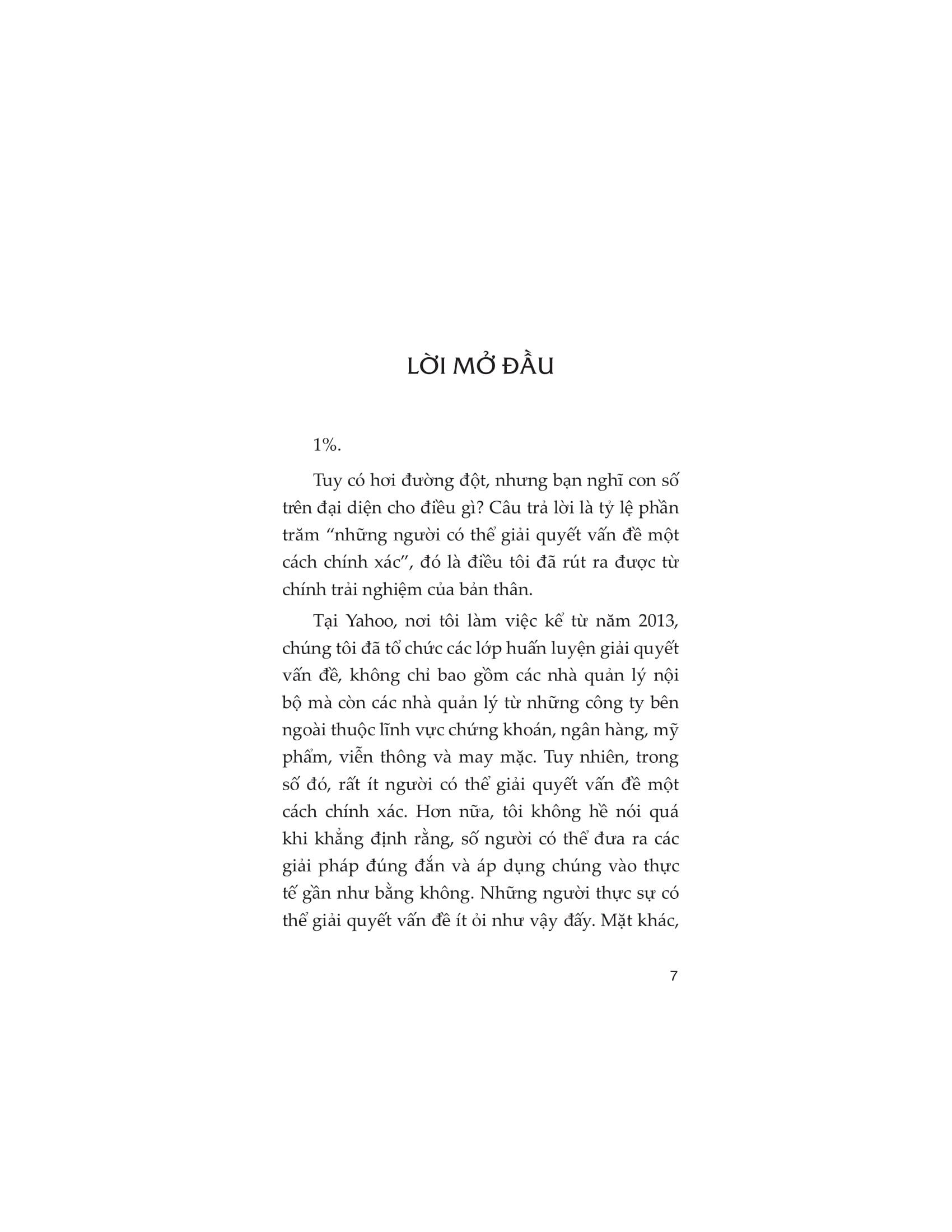 Nếu bạn khao khát trở thành một nhân sự xuất sắc, người có thể đứng trong top 1% và được tin tưởng giao phó những nhiệm vụ khó khăn nhất, thì cuốn sách này là dành cho bạn. Để trở thành nhân sự xuất sắc, bạn cần khả năng tư duy sắc bén, giải quyết vấn đề nhanh chóng và chính xác, và đặc biệt là biết cách biến thử thách thành cơ hội. Cuốn sách sẽ hướng dẫn bạn qua phương pháp tư duy 4 bước – một hệ thống giúp bạn tháo gỡ các nút thắt từ đơn giản đến phức tạp. Những quy tắc và bài học thực chiến được tác giả đúc kết từ kinh nghiệm thực tế, sẽ giúp bạn nắm bắt từng bước xử lý vấn đề, làm chủ tình huống, và mang lại kết quả mà không phải ai cũng có thể đạt được.