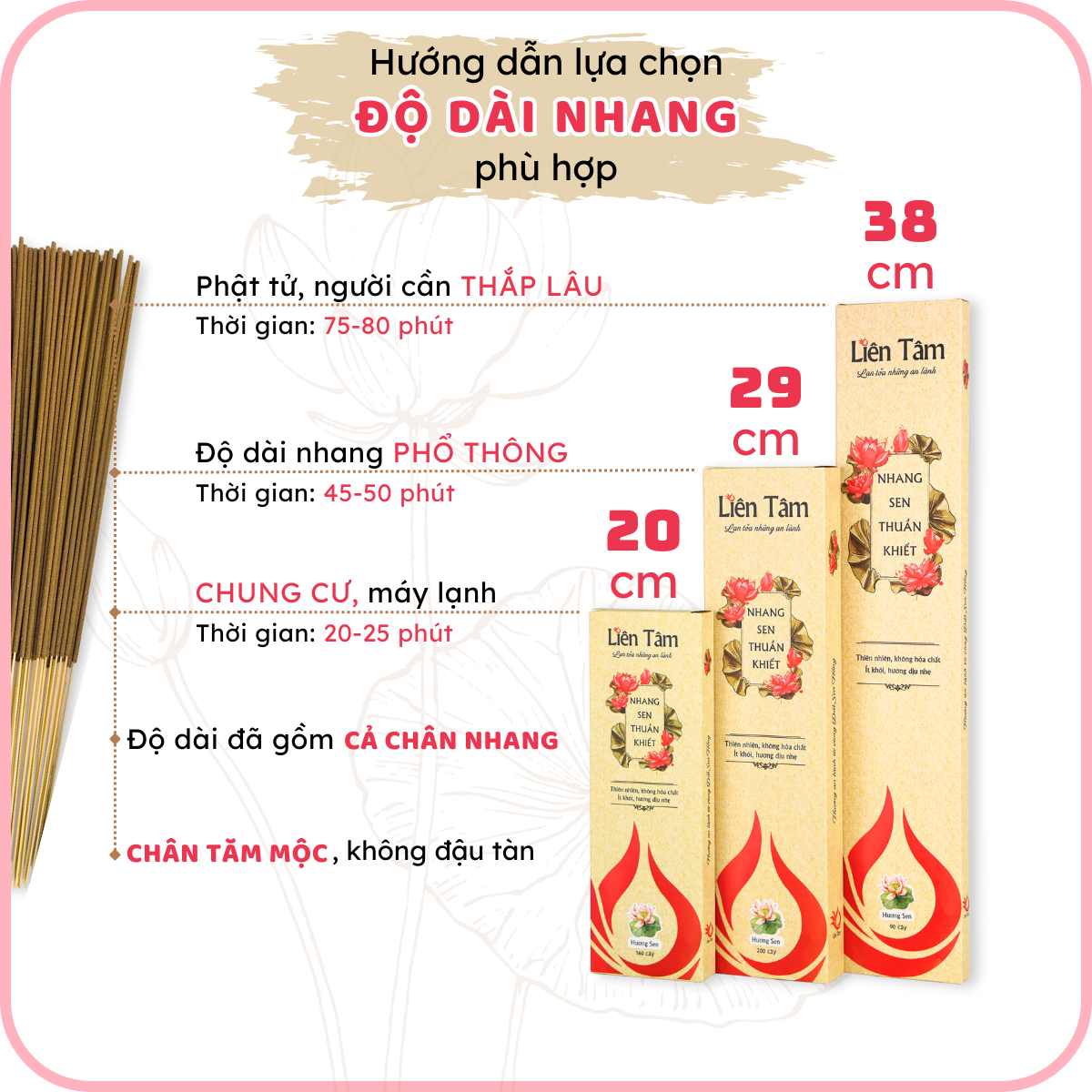 Mua tại TiktokNHANG SEN THUẦN KHIẾT LIÊN TÂM - một giải pháp tâm linh an lành cho những gia đình hiện đại NHANG SEN KHUYNH DIỆP LIÊN TÂM - nhang sạch hoàn toàn thiên nhiên Thông tin chi tiết về sản phẩm Nhang Sen Khuynh Diệp Liên Tâm - nhang sạch hoàn toàn thiên nhiên Thành phần: bột đài sen, bột lá khuynh diệp (bạch đàn) Quy cách và thời gian cháy: - Độ dài 20cm - hộp 160 cây - 20-25 phút - Độ dài 29cm - hộp 200 cây - 45-50 phút - Độ dài 38cm - hộp 90 cây - 75-80 phút HÃY NHẮN TIN CHO CHÚNG TÔI ĐỂ ĐƯỢC TƯ VẤN LỰA CHỌN LOẠI NHANG PHÙ HỢP TẠI SAO LÀ NHANG SEN LIÊN TÂM?️