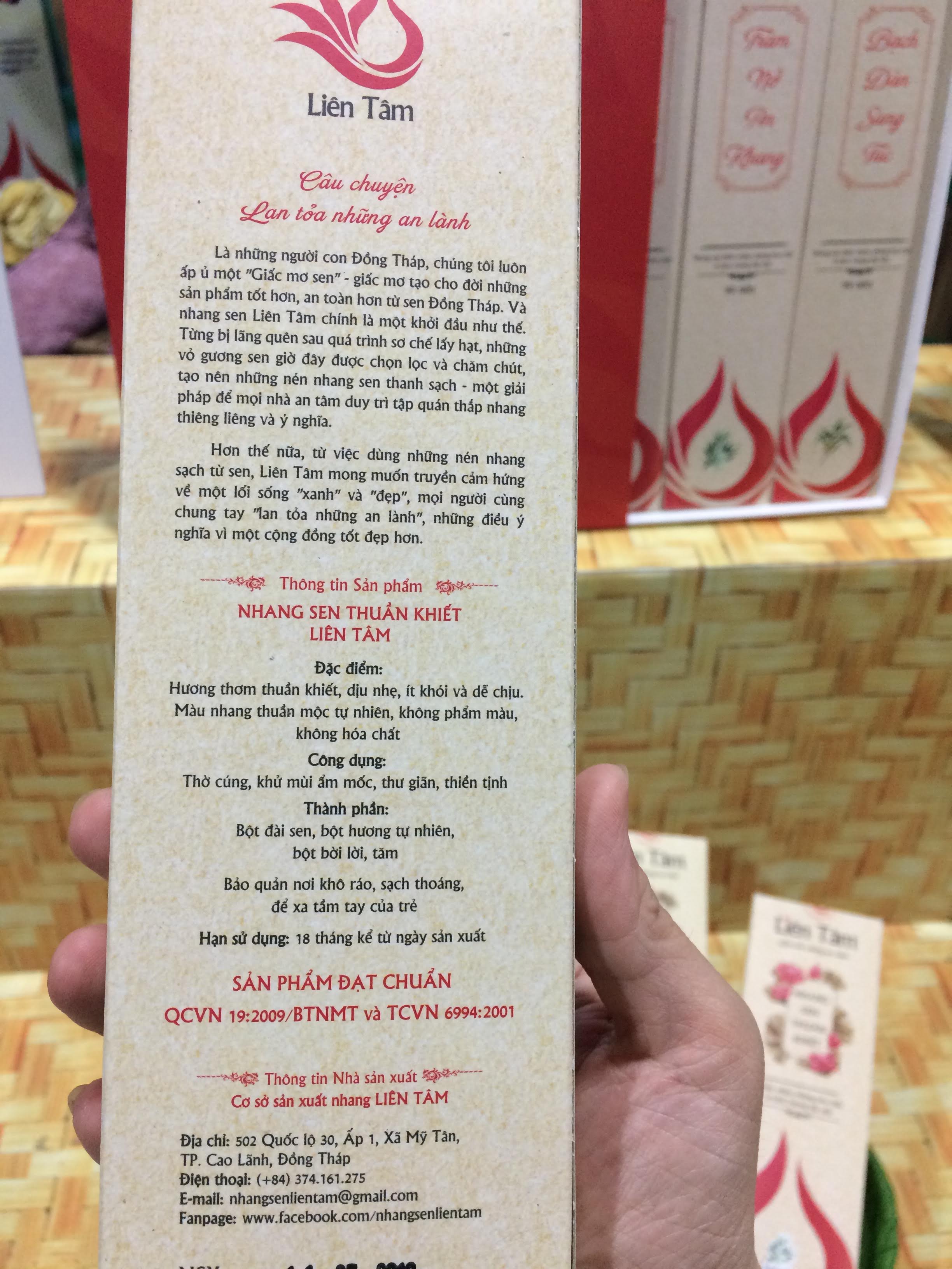NHANG SEN LIÊN TÂM - NHANG SẠCH 100% TỪ THIÊN NHIÊN Cây sen đã gắn liền với bà con Đồng Tháp Mười từ bao đời nay. Nhang được làm từ Sen tuy lạ mà quen, dần dần đã gắn liền với bàn thờ Tổ tiên – Thần phật của bà con Đồng Tháp lúc nào không hay Thành phần: Bột đài sen, bột vỏ bời lời tự nhiên, tăm tre Quy chuẩn: 160 cây nhang, độ dài 20cm Thời gian cháy: 25-30 phút/cây Hạn sử dụng: 18 tháng kể từ ngày sản xuất Sau quá trình phơi sấy và tuyển chọn kỹ càng, những đài sen đạt chuẩn được nghiền mịn và phối trộn theo tỷ lệ phù hợp, tạo thành những nén Nhang Sen Thuần khiết với hương thơm nhẹ nhàng, thanh thoát. Với đặc trưng rất ít khói và mùi hương thật sự dịu nhẹ, Nhang Sen Thuần khiết vẫn an toàn với những vị khách nhạy cảm nhất. Nhang sen thuần khiết hương thơm dịu nhẹ, ít khói phù hợp với những gia đình có không gian kín, chung cư, trần thấp, gia đình có trẻ nhỏ, có người nhạy cảm với khói nhang hoặc mùi hương, thắp nhang nơi sinh hoạt chung Khói nhang đạt chuẩn QCVN 19:2009/BTNMT và TCVN 6994:2001                        Ngoài ra, Liên Tâm còn có :                       - Nhang sen hương tràm diệt khuẩn: từ bột lá tràm                       - Nhang sen hương xưa : từ sen, vỏ quế, đại hồi Nhang ít khói - Có nhang sen Cần nhang sạch - nhớ Liên Tâm CẢM ƠN BẠN ĐÃ TIN CHỌN LIÊN TÂM