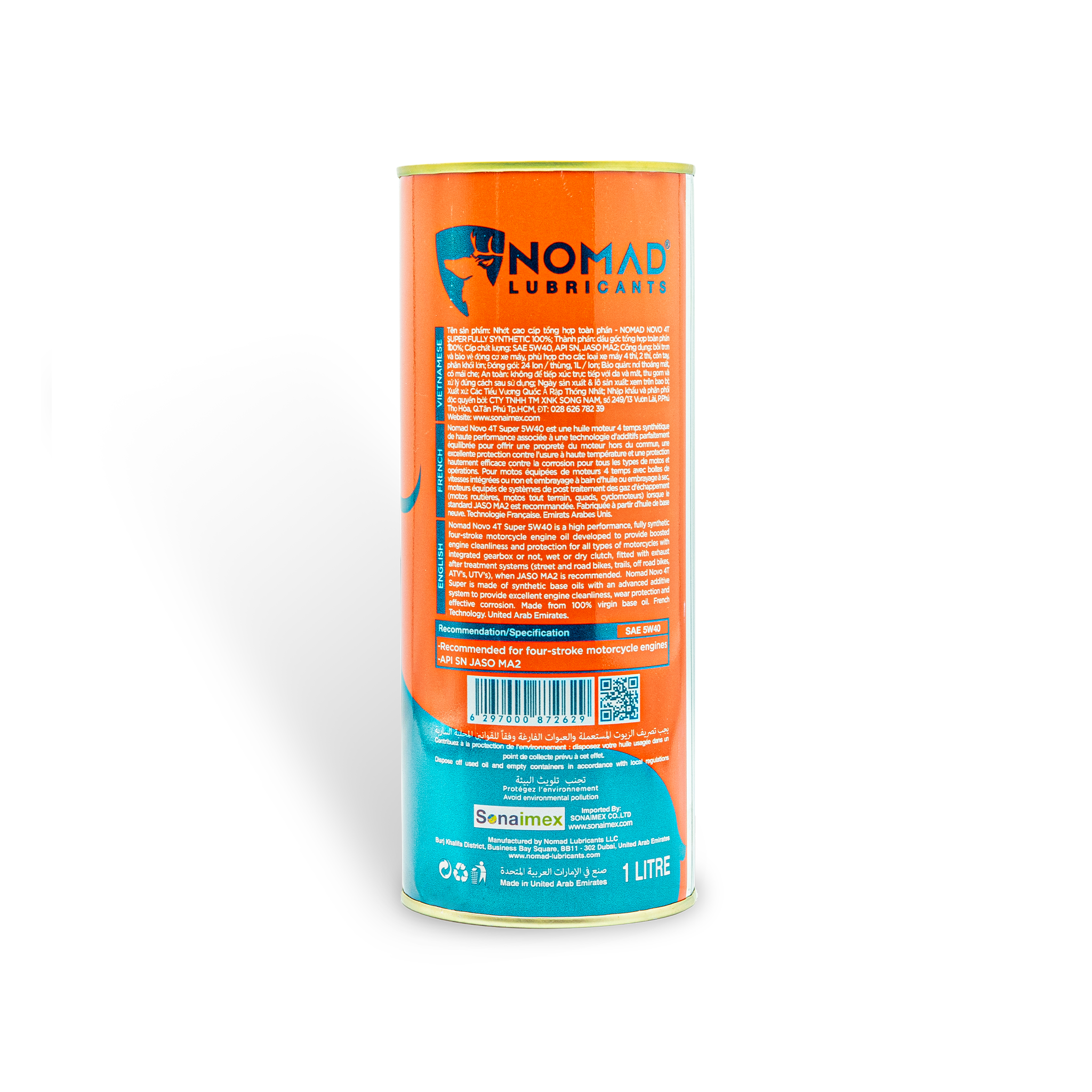 • Thu gom và xử lý đúng cách sau sử dụng để bảo vệ môi trường. Không vứt bao bì, không đổ dầu nhớt xuống đất, nguồn nước   VỀ THƯƠNG HIỆU DẦU NHỚT NOMAD LUBRICANTS Nomad Lubricants được thành lập năm 1998 tại xứ sở dầu mỏ khổng lồ Dubai. Ban đầu, Nomad chỉ tập trung vào một số dòng sản phẩm dầu nhớt chuyên biệt, dầu thủy lực và nước làm mát động cơ. Đến năm 2005, công ty bắt đầu mở rộng hoạt động sản xuất qua dầu nhớt vận tải, công nghiệp và hàng hải. Năm 2010, công ty mở rộng gấp đôi diện tích và công suất sản xuất. Năm 2015, công ty đầu tư  dây chuyền công nghệ hiện đại từ Pháp, cho ra đời nhiều sản phẩm dầu nhớt tổng hợp toàn phần chất lượng cao, đáp ứng hoàn hảo các tiêu chuẩn quốc tế về dầu nhờn. Năm 2017, Nomad hợp tác cùng Công Ty TNHH TM Xuất Nhập Khẩu Song Nam (Sonaimex) bắt đầu phân phối thương hiệu Nomad tại thị trường Việt Nam. Công nghệ sản xuất hiện đại của Nomad kết hợp sự thấu hiểu thị hiếu người tiêu dùng nội địa của Sonaimex đã cho ra mắt dòng nhớt tổng hợp toàn phần cao cấp chuyên biệt cho các dòng xe tay côn, dung tích đặc biệt 1.1L và 1.3L chính thức đầu tiên tại Việt Nam. Sự thành công của sản phẩm giúp thương hiệu Nomad có tiếng vang trong phân khúc khách hàng hướng đến và được người tiêu dùng yêu mến lựa chọn. Công nghệ hàng đầu Châu Âu cộng với trụ sở ngay tại xứ sở dầu mỏ, NOMAD LUBRICANTS sở hữu lợi thế về sản phẩm chất lượng cao nhưng giá thành cạnh tranh. Danh mục sản phẩm của NOMAD rất đa dạng, từ dầu nhớt dành cho xe máy, xe ô tô, vận tải, tàu thuyền, máy móc công nghiệp nặng – nhẹ, đến các dòng phụ gia và bảo dưỡng chăm sóc động cơ. VÌ SAO NÊN CHỌN NHỚT NOMAD