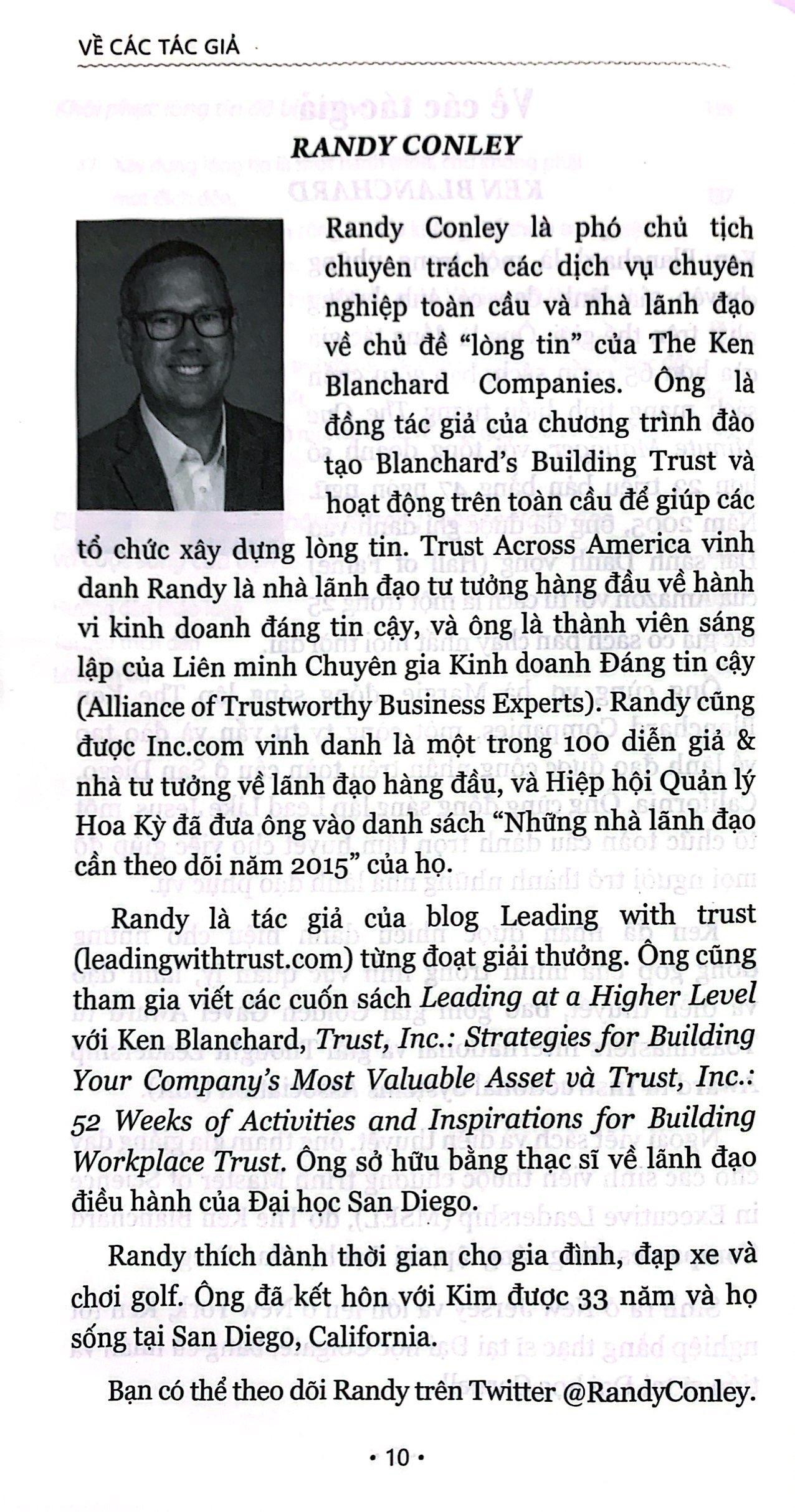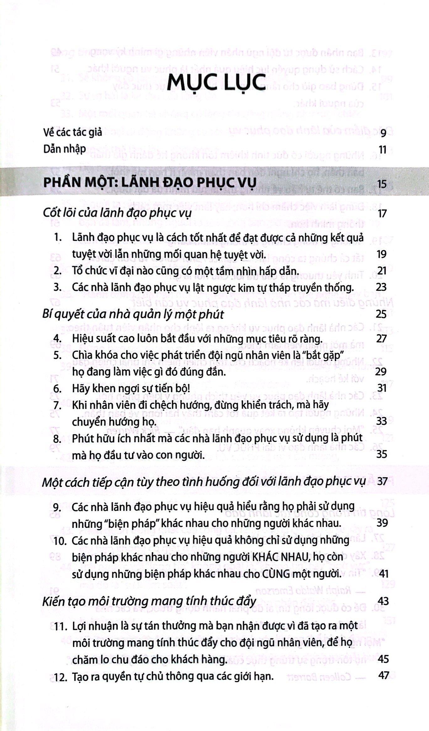 Những Chân Lý Đơn Giản Về Lãnh Đạo Cách thức để trở thành một lãnh đạo phục vụ & kiến tạo lòng tin. Biến lẽ thường thành thông lệ. Lãnh đạo hiệu quả là một quá trình tạo ảnh hưởng, mà ở đó các nhà lãnh đạo tiến hành những phương pháp tiếp cận theo lẽ thường, hằng ngày để giúp đội ngũ nhân viên và tổ chức phát triển thịnh vượng. Tuy nhiên, vì một lý do nào đó, nhiều nguyên tắc trong số những nguyên tắc cơ bản này vẫn chưa được áp dụng ở hầu hết các nơi làm việc. Trong “Những chân lý đơn giản về lãnh đạo”, chuyên gia huyền thoại về lãnh đạo phục vụ là Ken Blanchard, tác giả của những cuốn sách đã bán được hàng triệu bản trên toàn thế giới, và đồng nghiệp Randy Conley, người được cả thế giới biết đến và công nhận vì nhiều năm nghiên cứu về lãnh đạo tư tưởng cũng như sự tinh thông về lĩnh vực “lòng tin”, cùng chia sẻ 52 chân lý đơn giản về lãnh đạo. Những chân lý này sẽ giúp các nhà lãnh đạo ở khắp mọi nơi biến “lãnh đạo theo lẽ thường” thành những thông lệ. Chứa đựng những hiểu biết sâu sắc, đáng nhớ và đôi khi ngược đời về lãnh đạo, cuốn sách này là một tài liệu tổng hợp gồm hai phần về những niềm tin không thể lay chuyển của Blanchard và Conley về lãnh đạo phục vụ và xây dựng lòng tin – hai lĩnh vực chuyên môn tương ứng của họ. Bạc đọc sẽ được khám phá: