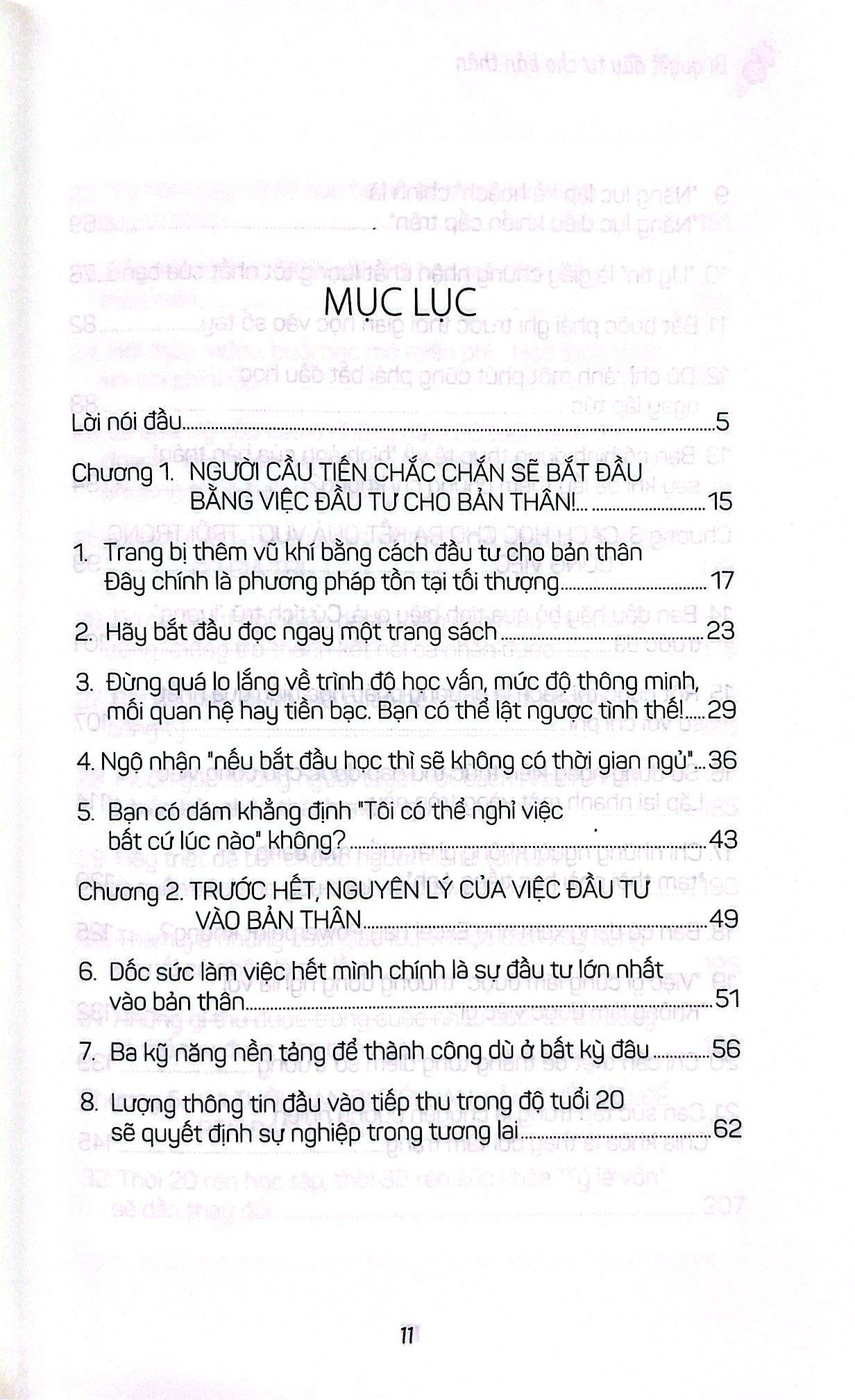 Những Điều Công Ty Không Dạy Bạn - Bí Quyết Đầu Tư Cho Bản Thân - Dành Cho Người Muốn Phát Triển Thần Tốc Đầu tư vào bản thân đã giúp tôi thay đổi cuộc đời, thay đổi vị trí bản thân được đặt vào, và dần dần mở rộng khả năng của bản thân tôi. Thay vì an phận với lối suy nghĩ chấp nhận vị trí m.ình đang được sắp đặt và xem tương lai chỉ là đường kéo dài của quá khứ và hiện tại, tôi luôn suy nghĩ về tương lai. Tức là tính ngược từ vị trí thành công trong tương lai để xác định những việc cần thiết để đầu tư vào bản thân cho từng thời điểm hiện tại. Đầu tư vào bản thân không phải là thứ có thể mang lại thành quả ngay lập tức trong ngày một ngày hai. Vì thế, bạn đừng quá để tâm tới thành quả nhãn tiền, mà hãy thực hiện với mục đích nâng cao thực lực của bản thân với tầm nhìn năm đến mười năm sau. Ngoài ra trong cuộc sống cũng như trong công việc, không bao giờ tồn tại một công thức thành công nào dành cho tất cả mọi người. Vì vậy, việc đầu tư vào bản thân phải do tự m.ình suy nghĩ, và cần phải chọn một phương pháp cũng như đối tượng đầu tư mang "màu sắc cá nhân". Có lẽ khi nghe đến cụm từ "đầu tư cho bản thân" bạn sẽ tưởng tượng đến những chuyện như phải đi tới những buổi hội thảo, mở rộng các kết nối cá nhân hay dồn sức thi thố lấy thật nhiều chứng chỉ Trong cuộc sống cũng như công việc, việc có nhiều sự lựa chọn hay không sẽ ảnh hưởng rất nhiều tới sự thoải mái về tinh thần cũng như hạnh phúc. Chúng ta thường nghe rất nhiều về "phong cách cá nhân". Tuy nhiên, để xây dựng được một phong cách cá nhân, chúng ta cần có khoảng thời gian để đầu tư vào bản thân, tức là đầu tư vào mọi khía cạnh trong cuộc sống để gia tăng thêm những sự lựa chọn thực tế đối với bản thân. Nếu không đầu tư, bạn sẽ không có gì nhận lại. Giả sử, nếu đang bất mãn với hoàn cảnh hiện tại, việc đầu tư một cách thích hợp vào bản thân sẽ giúp chúng ta thay đổi cuộc đời, bất kể tuổi tác. Chỉ cần bước một bước nhỏ ban đầu và kiên định trên con đường đã chọn, nhất định sẽ tạo ra được thành quả. Ai cũng chỉ có một lần để sống. Và hơn thế, cuộc đời chính là một chuyến đi tìm kiếm hạnh phúc và hạnh phúc sẽ dần xuất hiện theo mỗi bước chân trên hành trình đó. Chính vì vậy, ai cũng muốn sống một cuộc sống vui vẻ và có ý nghĩa. Các bạn hãy tham gia vào hành trình đầu tư cho bản thân để mở rộng tối đa năng lực của m.ình. Thông qua cuốn sách này, tôi hi vọng sẽ có nhiều người cũng nhận ra tầm quan trọng của việc đầu tư vào bản thân dù chỉ một chút thôi, và bắt đầu bước đi đầu tiên để mở rộng thêm sự lựa chọn cho chính m.ình.
