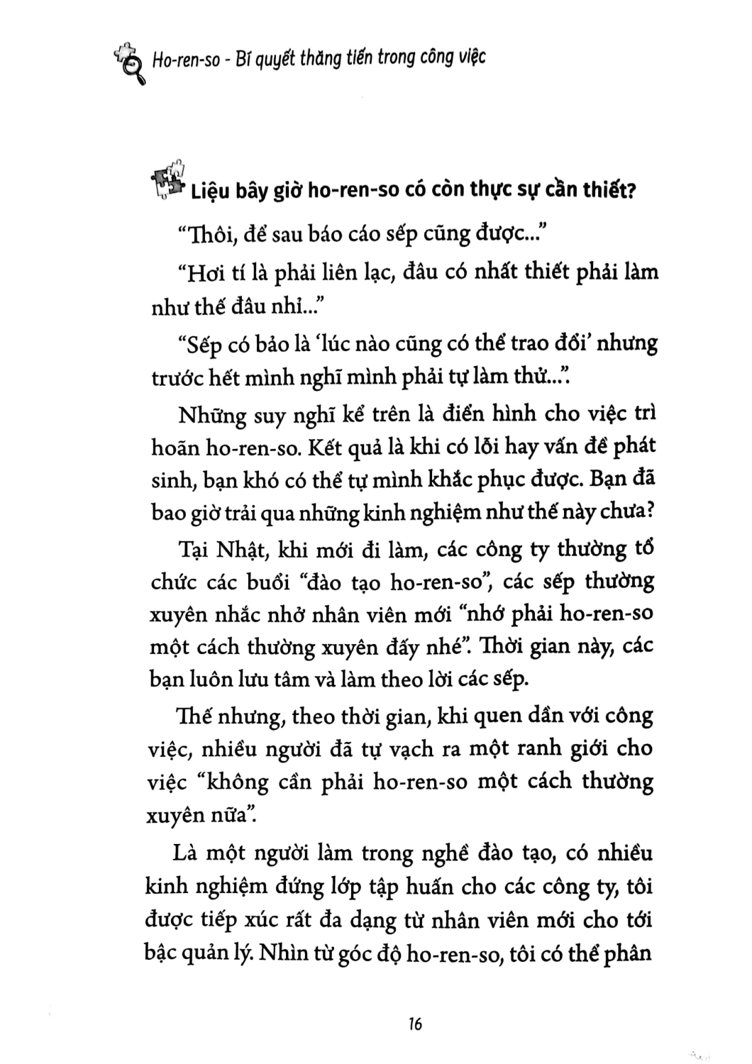 Cuốn sách này sẽ đặt trọng điểm vào kỹ năng cơ bản, thậm chí có khi bạn sẽ nghĩ là không cần thiết, đó chính là kỹ năng Horenso. Đối tượng phù hợp nhất với cuốn sách này là nhân viên trẻ đang phải đau đầu với những thắc mắc như không được đánh giá cao dù đang rất nỗ lực làm việc hết mình, hay công việc không tiến triển như mong muốn.