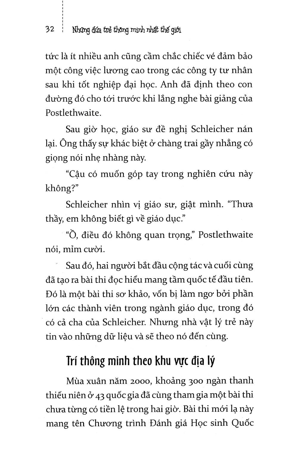 “Các quốc gia thành công nhất hoặc tiến bộ nhất dường như phù hợp với ba kiểu mẫu cơ bản: 1) mô hình không tưởng của Phần Lan, một hệ thống được xây dựng trên cơ sở niềm tin, trong đó trẻ em đạt được tư duy bậc cao mà không có sự cạnh tranh quá mức hoặc sự can thiệp của cha mẹ; 2) mô hình nồi áp suất của Hàn Quốc, nơi bọn trẻ bị ép học đến mức chính phủ phải đưa ra một lệnh giới nghiêm về học tập; và 3) mô hình lột xác của Ba Lan, một quốc gia đang đà đi lên, với tỷ lệ trẻ em nghèo tương đương Mỹ, nhưng lại đạt được mức tăng trưởng ấn tượng gần đây về những gì trẻ em biết.”