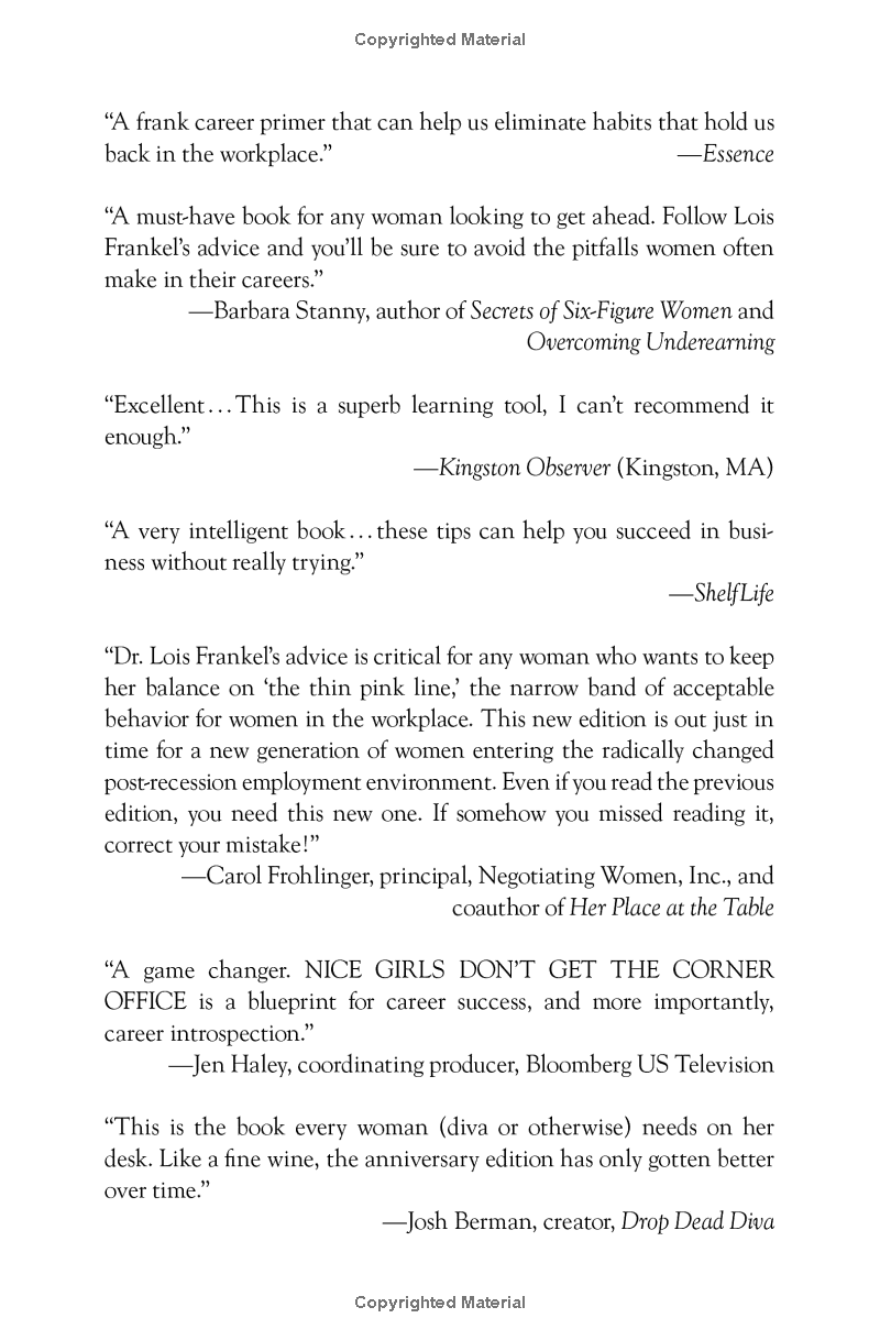 The New York Times bestseller, which for 10 years has been a must-have for women in business, is now completely revised and updated. In this new edition, internationally recognized executive coach Lois P. Frankel reveals a distinctive set of behaviors-over 130 in all-that women learn in girlhood that ultimately sabotage them as adults. She teaches you how to eliminate these unconscious mistakes that could be holding you back and offers invaluable coaching tips that can easily be incorporated into your social and business skills. The results for hundreds of thousands of women have been career opportunities they never thought possible-at every stage of their career, from entry-level to the corner office! Stop making "nice girl" errors that can become career pitfalls.