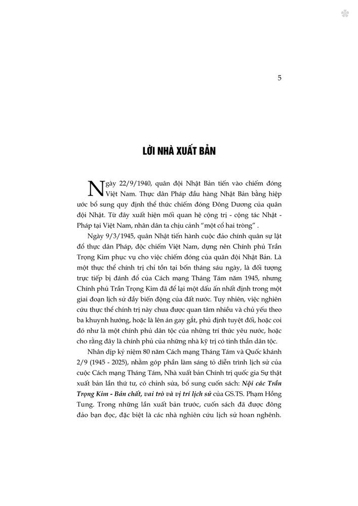 Cuốn sách: Nội các Trần Trọng Kim - Bản chất, vai trò và vị trí lịch sử của GS.TS. Phạm Hồng Tung. Trong những lần xuất bản trước, cuốn sách đã được đông đảo bạn đọc, đặc biệt là các nhà nghiên cứu lịch sử hoan nghênh.