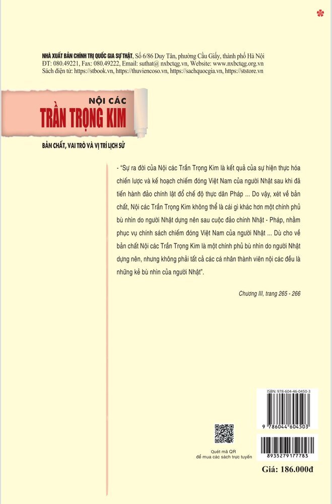 Nội các Trần Trọng Kim “Nội các Trần Trọng Kim” - cuốn sách nghiên cứu một cách toàn diện, sâu sắc và cụ thể về hoàn cảnh, nguyên nhân ra đời, các chủ trương, chính sách