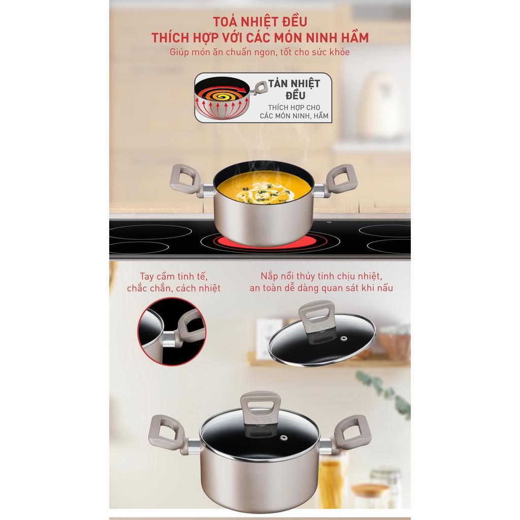 Đáy 3 lớp truyền nhiệt nhanh – giúp nấu chín đều, tiết kiệm thời gian Vung kính chịu nhiệt có lỗ thoát hơi – tiện theo dõi món ăn không cần mở nắp Chất liệu