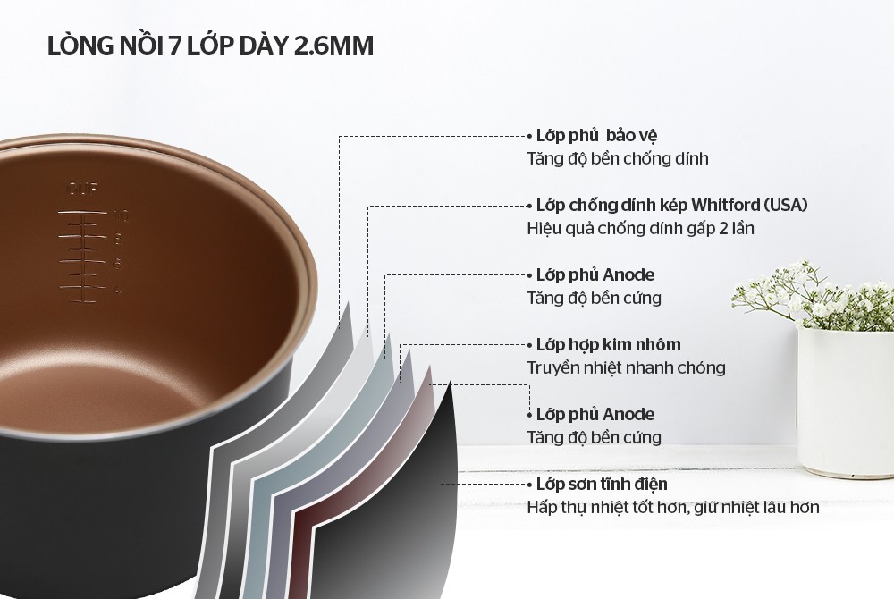 ĐẶC ĐIỂM NỔI BẬT: Nghiên cứu, thiết kế, kiểm soát chất lượng và sản xuất tại Việt Nam Lòng nồi dày 1.7mm, giữ ấm tốt, cơm dẻo thơm hơn Lớp chống dính kép cao cấp,