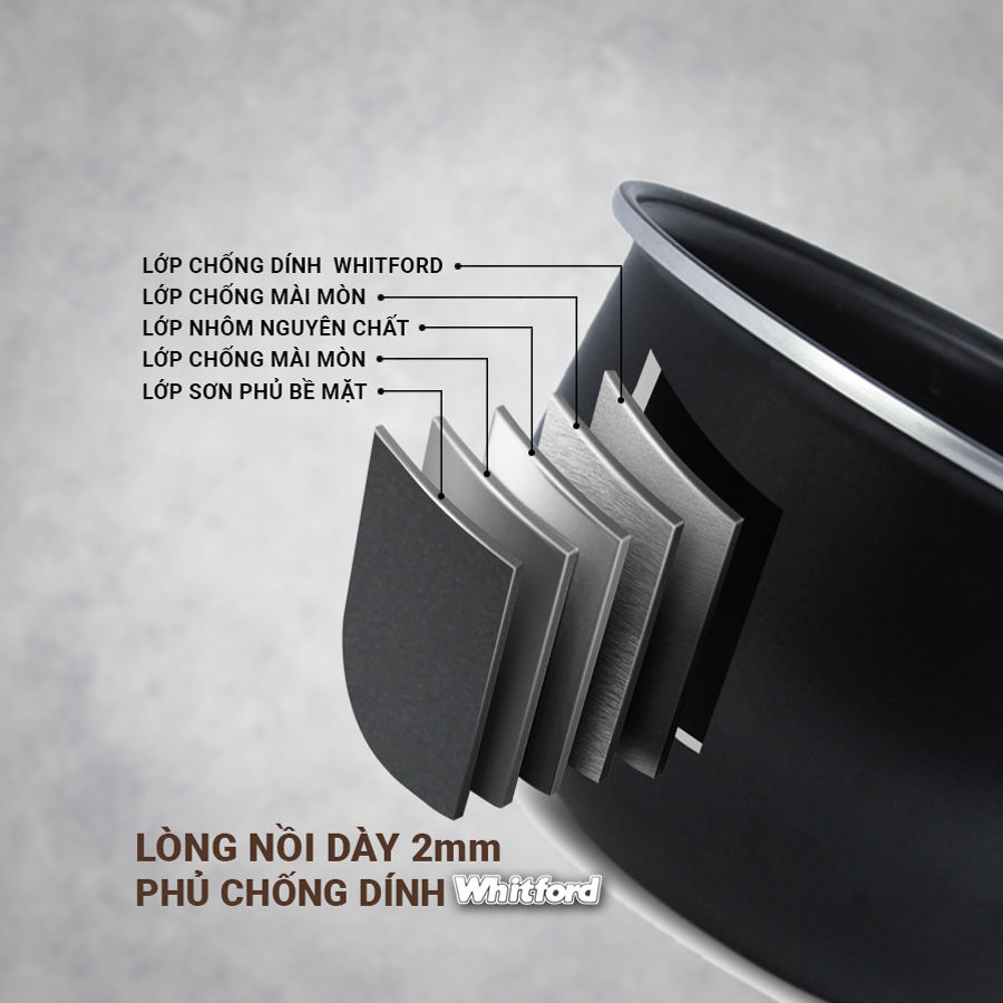 Lòng nồi dày 2mm, được phủ chống dính Whitford