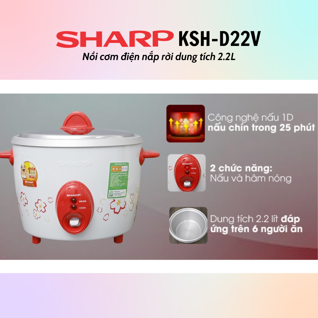 - Nồi Cơm Điện Nắp Rời Sharp KSH-D22V có dung tích 2.2L thích hợp cho những gia đình từ vừa đến đông thành viên (khoảng 5 - 6 người). Bạn có thể chỉ cần 1 lần nấu cho cả gia đình nhờ dung tích lớn và công suất lên đến 800W giúp cơm chính đều hơn ngay cả những vùng có điện áp thấp.