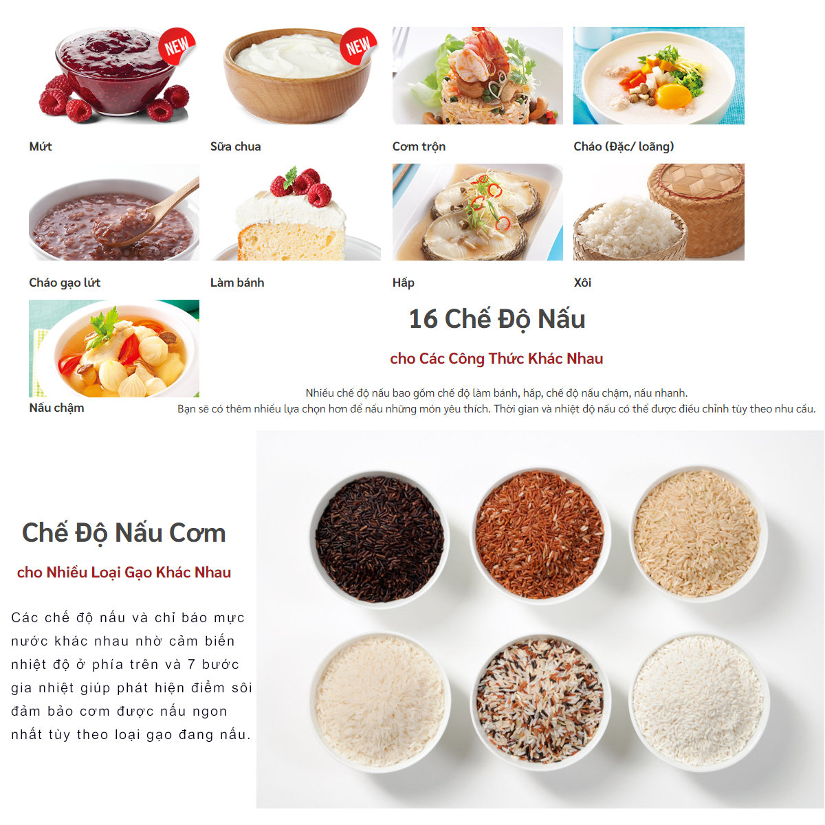 16 chế độ: Nấu nhanh, Gạo thơm/Gạo Nhật, Gạo trắng, Ngũ cốc, Gạo lứt, Xôi/Cơm trộn, Cháo trắng, Canh, Cháo ngũ cốc, Nấu chậm, Hầm, Bánh, Sữa chua, Mứt, Hấp, DIY