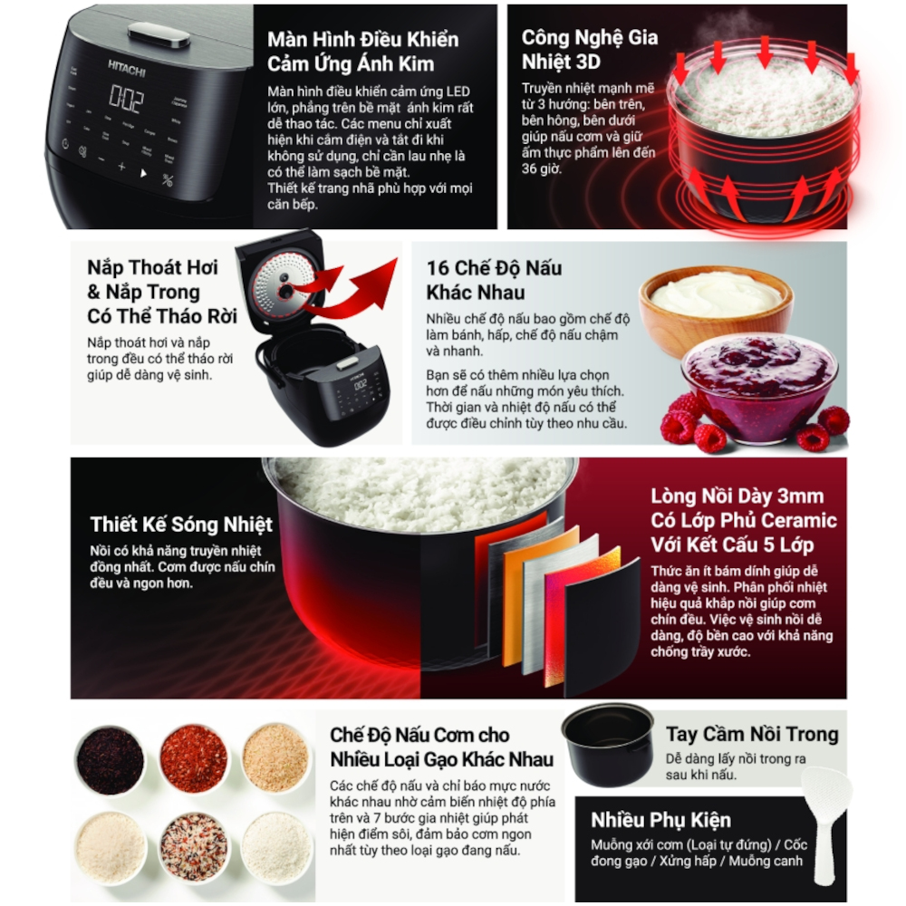 - Công nghệ nấu 3D cho nhiệt tỏa đều, cơm chín đều