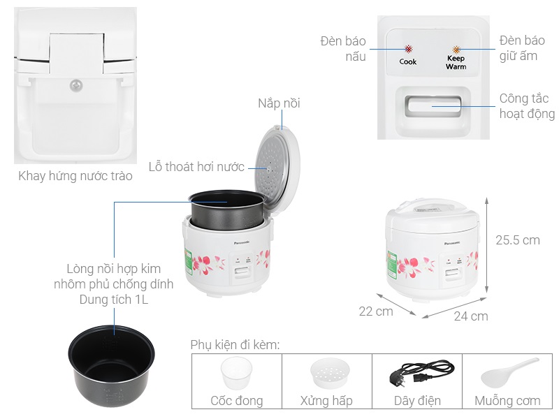- Điều chỉnh bằng nút gạt đơn giản, có đèn báo tiện theo dõi tình trạng cơm chín.