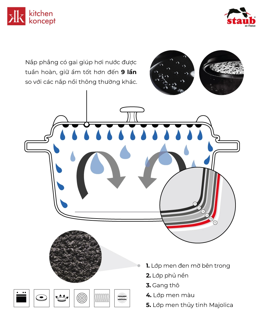 Về thương hiệu Là thương hiệu nồi chảo gang thủ công hàng đầu tại Pháp dành cho gia đình, nhà hàng, khách sạn nổi tiếng, đặc biệt là những người yêu thích ẩm thực đang tìm kiếm trải nghiệm nấu ăn đích thực và giàu cảm xúc, Staub kết hợp chặt chẽ giữa kỹ thuật thủ công truyền thống và công nghệ hiện đại. Nổi bật là công nghệ đúc gang nguyên khối và tráng men màu độc đáo giúp cho Staub mang hình thức bắt mắt, màu sắc tinh tế và sang trọng có thể đặt trực tiếp trên bàn ăn.