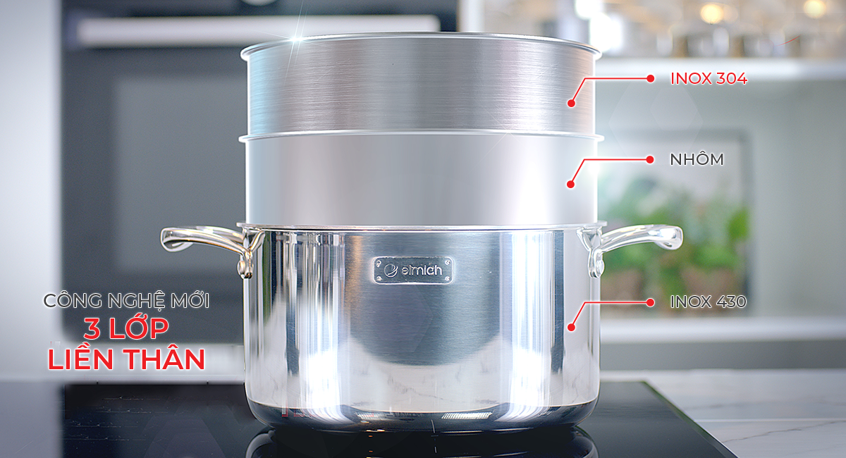 Trong cùng là lớp inox 304 cao cấp. Chính vì là phần tiếp xúc trực tiếp với thức ăn nên chất liệu mà Elmich sử dụng phải luôn đảm bảo an toàn cho sức khỏe cho dù được nung nóng ở nhiệt độ cao hay khi sử dụng lâu năm.
