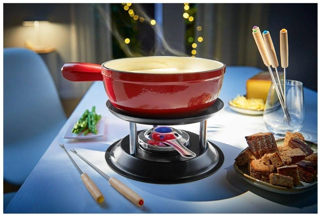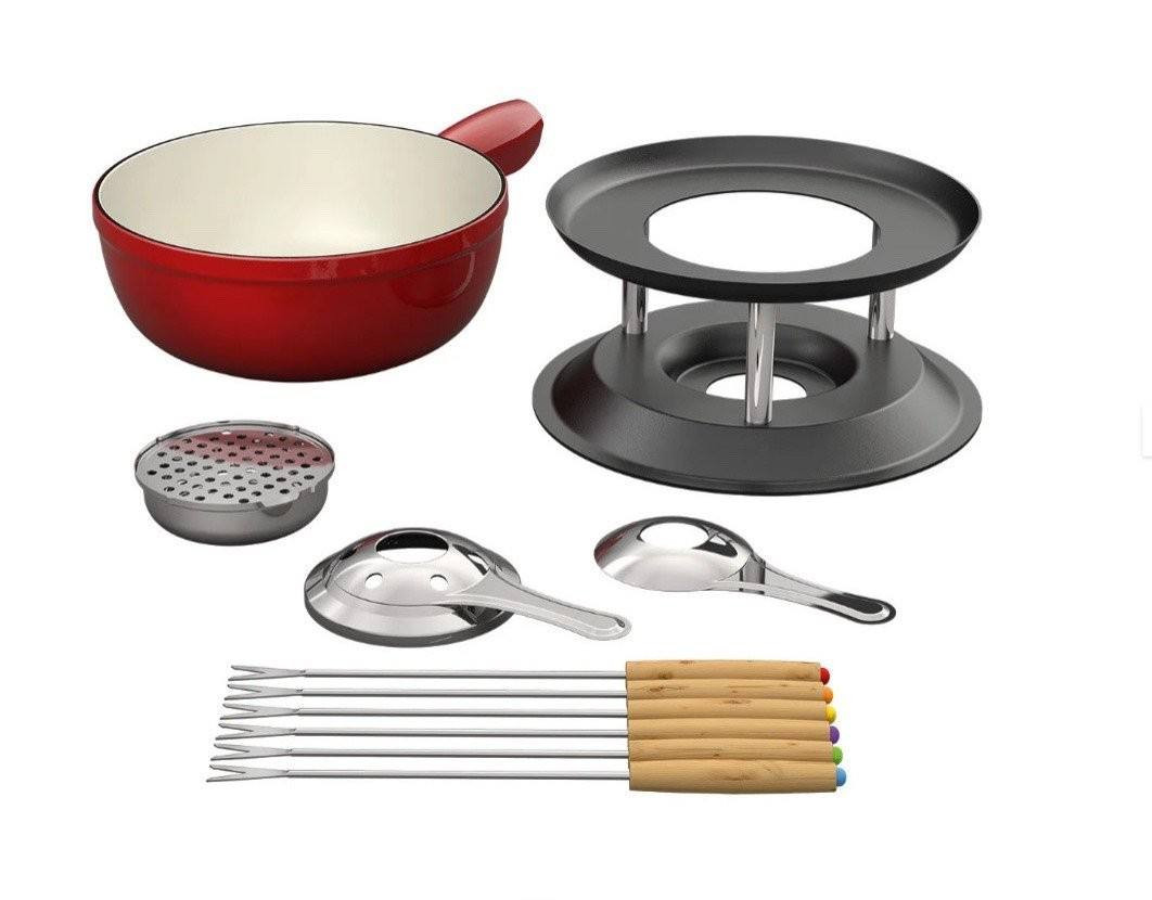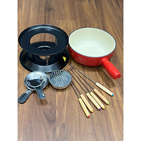 Dung tích: tối đa 2,0 L Bộ fondue gồm : 1 nồi gang tráng men ,1 Đế , 1 Đầu đốt dán , 6 Nĩa Fondue