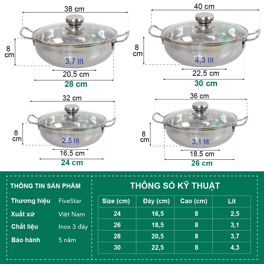 Chảo Inox 304 Fivestar size 32cm 3 đáy vung kính - Lẩu, xào, rán đủ kiểu - Bảo hành 5 năm 0986588655
