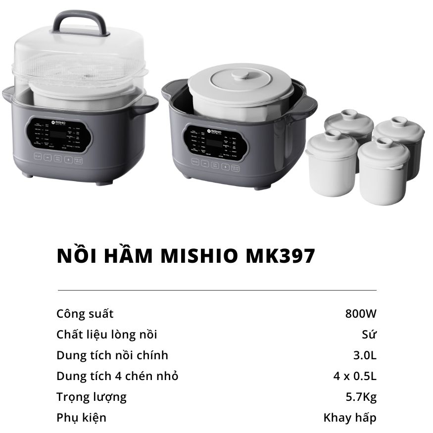 ✨Nồi nấu chậm lòng sứ 3L Mishio MK397 kèm xửng hấp và 4 thố sứ tiện lợi không lo cháy khét hay bong tróc chống dính - Hàng chính hãng
