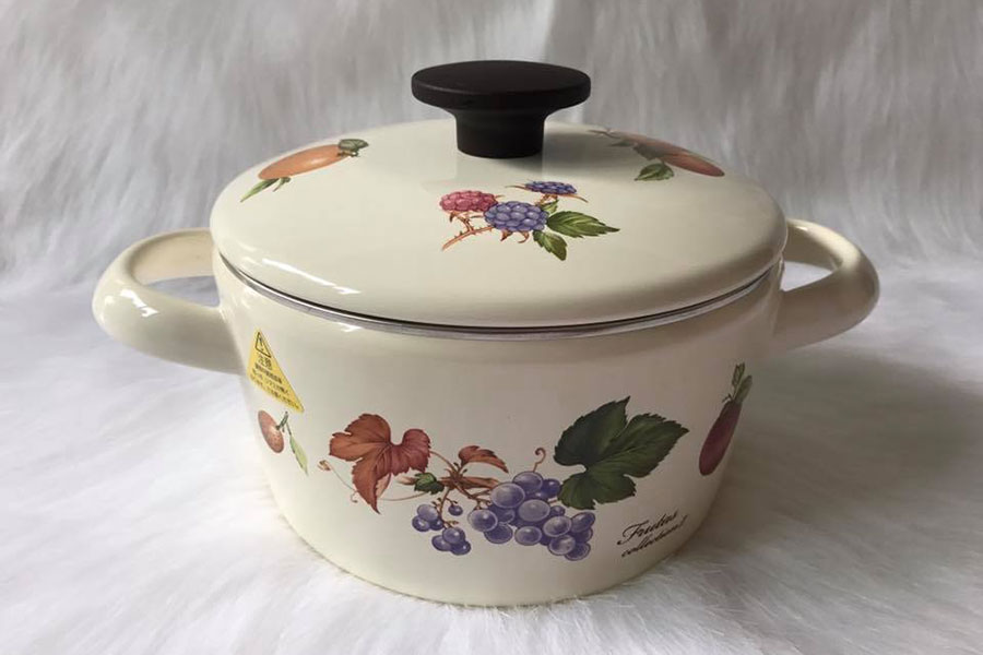 Thiết kế sang trọng, quai cầm và núm nắp chắc chắn Nồi Tráng Men Hoa Văn Trái Cây Sử Dụng Bếp Từ Fujihoro FRV-16W sở hữu thiết kế tinh tế với màu sắc và họa tiết