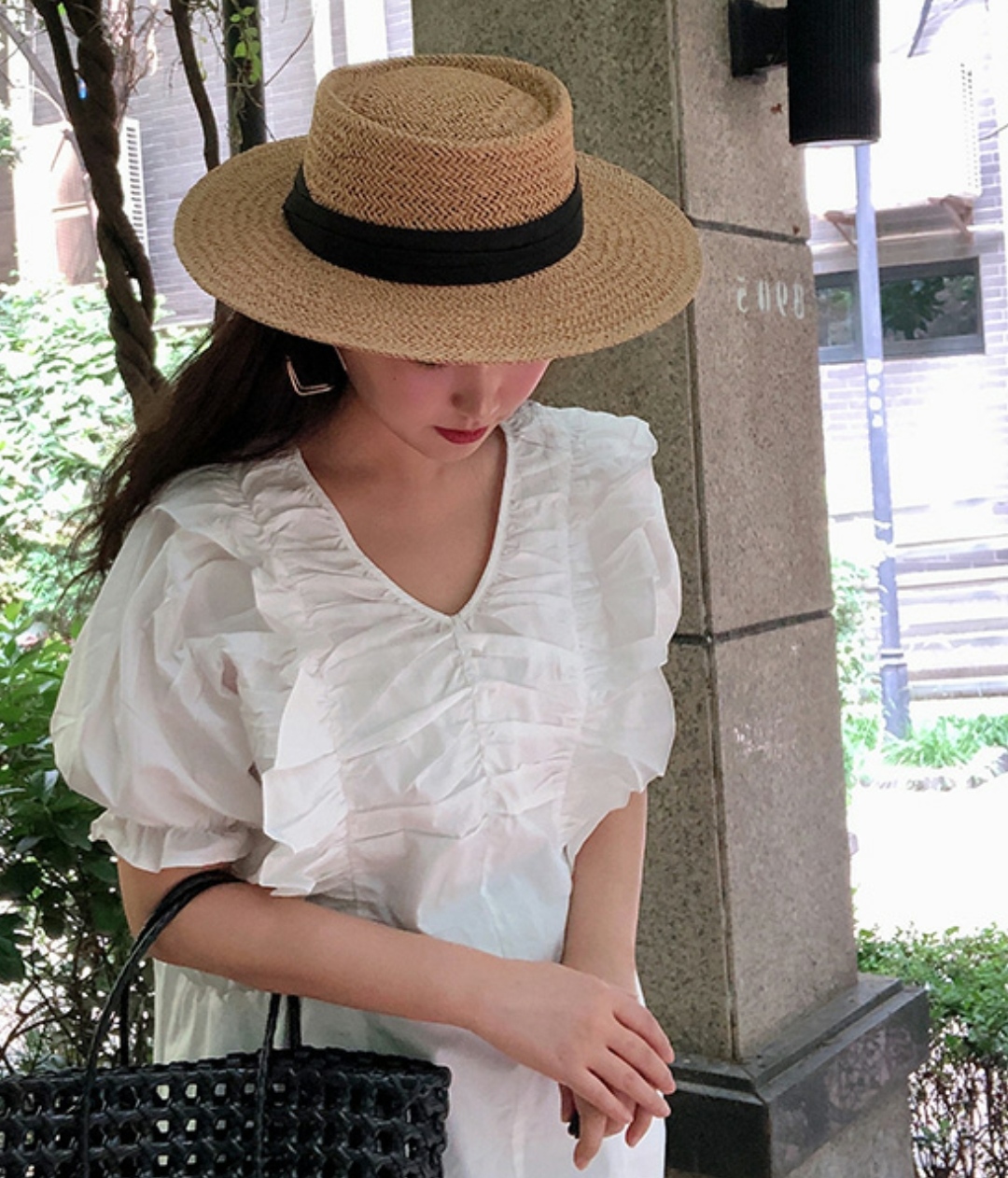 Mũ cói rơm vành phẳng nữ mùa hè phiên bản Hàn Quốc chống nắng UV cho kỳ nghỉ Nón đi biển Paris thời trang hàng đầu Pháp Chất liệu cói
