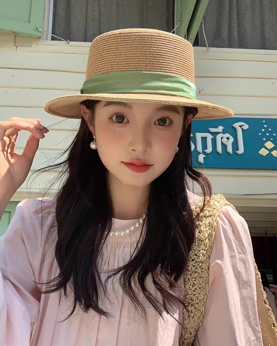 Mũ nón đi biển vành nhỏ chóp bằng phối đai trắng ngọc trai nhân tạo chất liệu cói chống nắng thoáng mát thời trang Hàn Quốc Chất liệu cói Kiểu dáng thời trang chống nắng