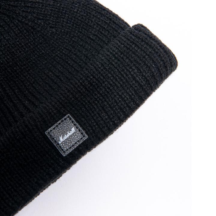 Classic minimalist unisex fisherman beanie in black with vegan leather Marshall logo badge. Tackle Cthulhu, Moby Dick, or The Kraken with ease… or just look slick in your day to day life. This super-soft, ribbed roll-knit beanie has an embroidered Marshall logo on a tag and is made with 100% cotton. Wavey. Features: 100% soft-touch cotton Handwash only