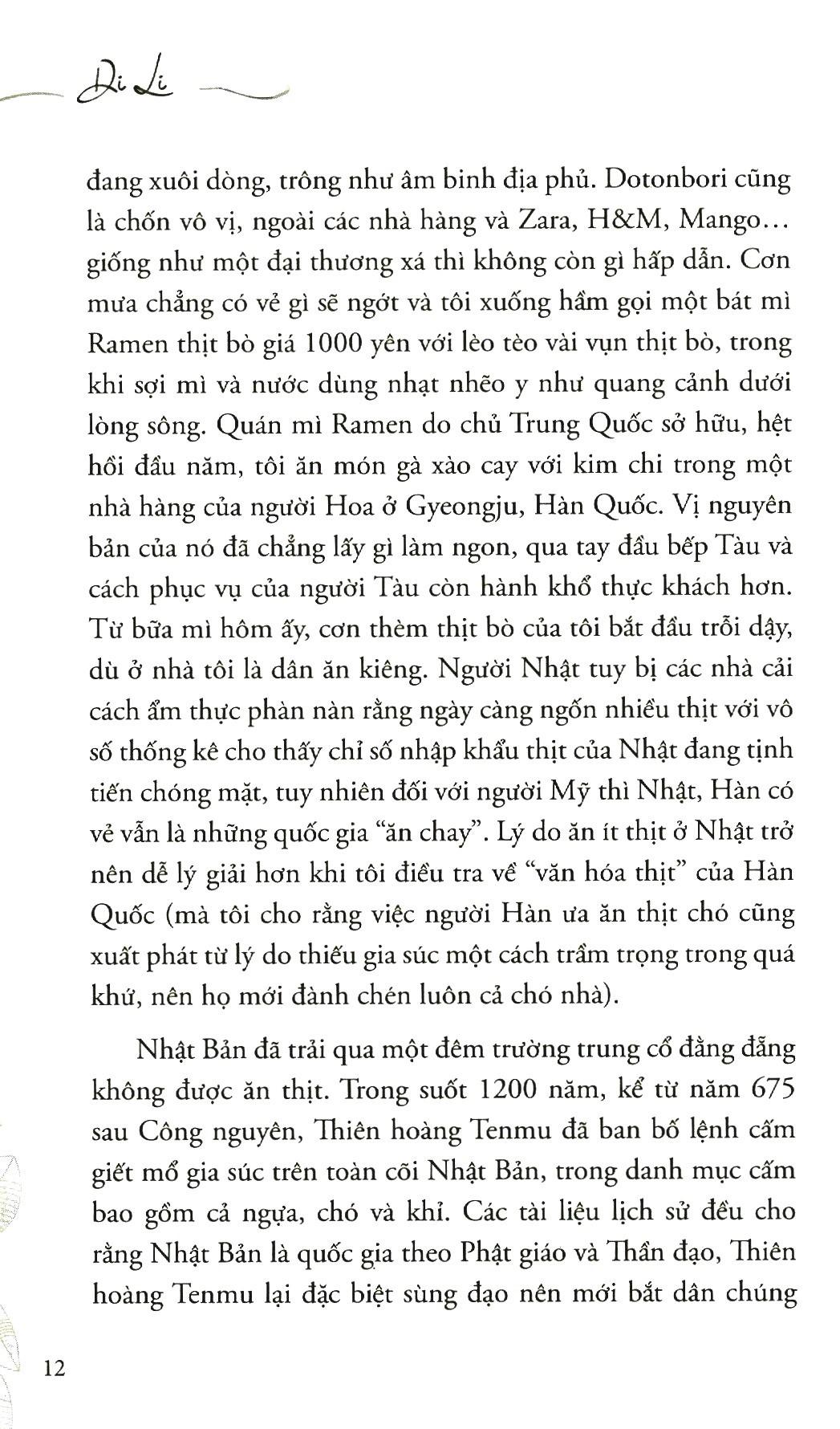 Trích sách: Những chú bò hạnh phúc giữa thành phố Kobe Chiều hôm trước tôi đã trải qua một bữa tối tẻ ngắt ở khu Dotonbori, vị trí được đánh dấu năm sao ở Osaka. Dotonbori có nhẽ là khu phố đi bộ sầm uất nhất vùng Kansai. Nó nổi tiếng bởi cây cầu gỗ bắc qua dòng sông lặng lờ. Người Nhật có truyền thống làm cầu gỗ, nên các lái buôn Nhật Bản sang đến Hội An định cư rồi ở lại đấy cũng xây một cây cầu gỗ nhỏ xinh cho du khách ngày nay qua lại. Lúc tôi vừa bước chân qua cầu thì trời đổ cơn mưa nặng hạt, mà tôi không biết rằng mấy ngày sau mưa sẽ muốn nuốt trôi cả thành phố này lẫn Kyoto và Hiroshima. Tôi đành trú tạm dưới chiếc dù trước cửa một nhà hàng và lơ đãng ngó những du khách đang đi thuyền trên sông. Trời mưa trắng xóa lòng nước, và con thuyền lừ đừ chở một đoàn lụp xụp áo mưa đang xuôi dòng, trông như âm binh địa phủ. Dotonbori cũng là chốn vô vị, ngoài các nhà hàng và Zara, H&M, Mống như một đại thương xá thì không còn gì hấp dẫn. Cơn mưa chẳng có vẻ gì sẽ ngớt và tôi xuống hầm gọi một bát mì Ramen thịt bò giá 1000 yên với lèo tèo vài vụn thịt bò, trong khi sợi mì và nước dùng nhạt nhẽo y như quang cảnh dưới lòng sông. Quán mì Ramen do chủ Trung Quốc sở hữu, hệt hồi đầu năm, tôi ăn món gà xào cay với kim chi trong một nhà hàng của người Hoa ở Gyeongju, Hàn Quốc. Vị nguyên bản của nó đã chẳng lấy gì làm ngon, qua tay đầu bếp Tàu và cách phục vụ của người Tàu còn hành khổ thực khách hơn. Từ bữa mì hôm ấy, cơn thèm thịt bò của tôi bắt đầu trỗi dậy, dù ở nhà tôi là dân ăn kiêng. Người Nhật tuy bị các nhà cải cách ẩm thực phàn nàn rằng ngày càng ngốn nhiều thịt với vô số thống kê cho thấy chỉ số nhập khẩu thịt của Nhật đang tịnh tiến chóng mặt, tuy nhiên đối với người Mỹ thì Nhật, Hàn có vẻ vẫn là những quốc gia “ăn chay”. Lý do ăn ít thịt ở Nhật trở nên dễ lý giải hơn khi tôi điều tra về “văn hóa thịt” của Hàn Quốc (mà tôi cho rằng việc người Hàn ưa ăn thịt chó cũng xuất phát từ lý do thiếu gia súc một cách trầm trọng trong quá khứ, nên họ mới đành chén luôn cả chó nhà). Nhật Bản đã trải qua một đêm trường trung cổ đằng đẵng không được ăn thịt. Trong suốt 1200 năm, kể từ năm 675 sau Công nguyên, Thiên hoàng Tenmu đã ban bố lệnh cấm giết mổ gia súc trên toàn cõi Nhật Bản, trong danh mục cấm bao gồm cả ngựa, chó và khỉ. Các tài liệu lịch sử đều cho rằng Nhật Bản là quốc gia theo Phật giáo và Thần đạo, Thiên hoàng Tenmu lại đặc biệt sùng đạo nên mới bắt dân chúng kiêng thịt. Nhưng tôi lại tin vào những nghiên cứu có lý hơn, ấy là tới thế kỷ thứ VII thì Nhật Bản thiếu đất canh tác trầm trọng tới mức ngay cả rừng cũng bị đốn hạ để làm cánh đồng và nơi chăn thả gia súc. Mà quốc đảo này lúc nào chả thiếu đất. Những hòn đảo đã chật hẹp lại chỉ toàn rừng với núi. Chẳng cần phải chờ đến thế kỷ 21, khi dân số Nhật Bản đã tăng lên hơn 127 triệu người, mà từ thời trung cổ, Nhật còn thiếu cả đất cho gia súc. Có lẽ bí quá mà Tenmu mới cực chẳng đã phải đưa ra quyết định này. Và lệnh cấm thịt trở nên hà khắc hơn cả vào thời kỳ Edo (1603-1867), tới mức người nào bị phát hiện ra vừa ăn thịt sẽ bị cấm túc ăn chay trong vòng 100 ngày. Người nào cả gan ngồi chung bàn với kẻ tội đồ đã từng phạm tộ ăn thịt cũng sẽ bị coi như tòng phạm, cấm túc 21 ngày. Người vô duyên hớ hênh không biết mà ngồi nhậu nhẹt với kẻ từng có bạn phạm tội ăn thịt thì bị phạt 7 ngày. Tất cả nhằm mục đích cô lập kẻ ăn thịt xấu xa. Con dân cả nước vì thế hầu như ăn chay, ngoài cá tôm ngoài biển khơi thì nhất định không được chạm tới thịt. Duy nhất có lính triều đình trong thời kỳ nghĩa vụ quân sự sẽ được phép ăn thịt để lấy sức chiến đấu. Nhưng đến khi giải ngũ về làm dân thì họ phải theo phép vua ăn chay trở lại. Nhiều giai thoại kể về những anh lính cuồng thịt (chắc cũng cuồng đến như chúng tôi mấy ngày trên đất Nhật, Hàn là cùng), là đã quen được nếm thịt trong quân ngũ nên khi trở lại ăn cơm “không người lái” thì thèm thịt không chịu nổi, thành thử lính giải ngũ của Thiên hoàng thi thoảng lại lén lút giết trộm một con vật để đánh chén, bất chấp hôm sau bị bêu ra trước công luận cũng đành. Những món ăn của nàng Dae Jang Gum