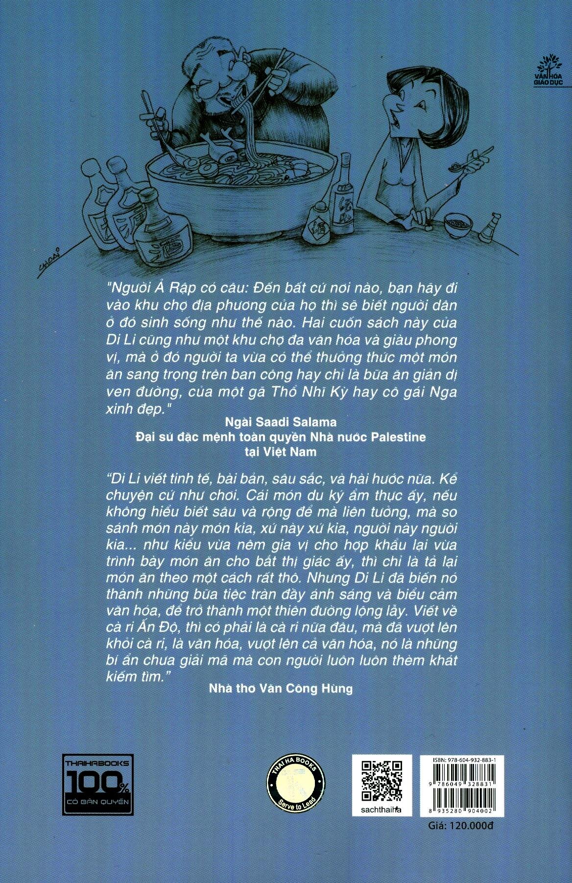 Mua tại TiktokNửa Vòng Trái Đất Uống Một Ly Trà “Chỉ cần qua dặm trang sách, Di Li đưa người ta từ Việt sang Nhật, từ Osaka tới Kobe, từ ngoài mưa vào trong bếp, cho người ta biết lịch sử ăn thịt của người Nhật, và khoa học hóa tuổi thọ của họ, hầu thỏa mãn trí tò mò của người đọc… Cuối cùng, Di Li mới kể-tả việc ăn thịt bằng mấy giác quan cùng với những kiến thức mờ ảo hư-thực kia, mà vẫn không quên báo giá. Đọc về ẩm thực kiểu này còn thấy “ngon” hơn là đi ăn thật. Đúng là văn du ký của một người chuyên viết chuyện trinh thám!” – Nhờ thơ Đỗ Trung Lai “Di Li viết tinh tế, bài bản, sâu sắc và hài hước nữa, kể chuyện cứ như chơi. Cái món du ký ẩm thực ấy, nếu không hiểu biết rộng và sâu để mà liên tưởng, để mà so sánh món này món kia, xứ này xứ kia, người này người kia…như kiểu vừa nêm gia vị cho hợp khẩu lại vừa trình bày món ăn cho bắt mắt thị giác thì chỉ là tả lại một món ăn theo một cách rất thô. Nhưng Di Li đã biến nó thành những bữa tiệc tràn đầy ánh sáng và biểu cảm văn hóa, để trở thành một thiên đường lộng lẫy. Viết về cà ri Ấn Độ thì có phải là cà ri nữa đâu, mà đã vượt lên khỏi cà ri, là văn hóa, vượt lên cả văn hóa, nó là những bí ẩn chữa giải mã mà con người luôn thèm khát kiếm tìm” – Nhà thơ Văn Công Hùng Nửa Vòng Trái Đất Uống Một Ly Trà - Cuốn sách du ký ẩm thực của tác giả Di Li. Với hơn 300 trang sách, Di Li đưa chúng ta chu du và thưởng thức ẩm thực từ vùng đất này đến vùng đất khác, khắp nơi thế giới. Bạn có thể tình cơ bắt gặp những chú bò Kobes hạnh phúc, đỉnh cao ẩm thực tối giản từ món Sushi của người Nhật, đến những món ăn mỹ vị Trung Hoa hay những món ăn từ Địa Trung Hải, Đại Tây Dươơn cả một cuốn sách du ký hay ẩm thực đơn thuần, cuốn sách hai trong một này sẽ đưa bạn từ bất ngờ này đến những bất ngờ khác để rồi bạn phải tự hỏi “phải chăng là mình đã đi vòng quanh thế giới?”.
