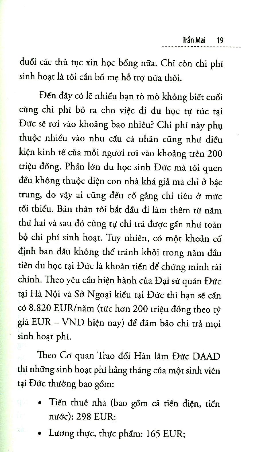 Trong cuốn sách này, tác giả sẽ kể cho bạn nghe về con đường du học của mình, về những kinh nghiệm với đủ cả nắng ấm và mưa rào, để bạn cân nhắc trước khi đưa ra lựa chọn cho bản thân. Lẽ dĩ nhiên là con đường của bạn rồi sẽ khác. Năm tháng qua đi, chỉ có những trải nghiệm và ký ức sẽ được lưu giữ. Dù cuối cùng, bạn quyết định như thế nào thì cũng hy vọng rằng, bạn đã sống trọn vẹn không có điều gì phải nuối tiếc.