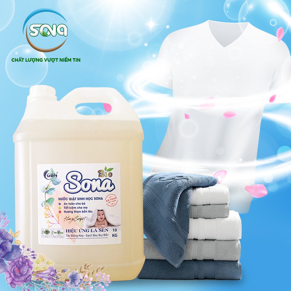 Nước giặt sinh học SONA 10kg giặt xả quần áo 2 trong 1 lưu hương suốt 24h sản phẩm được làm từ 100% thành phần thiên nhiên, an toàn cho cả gia đình, tiết kiệm hơn cho mẹ