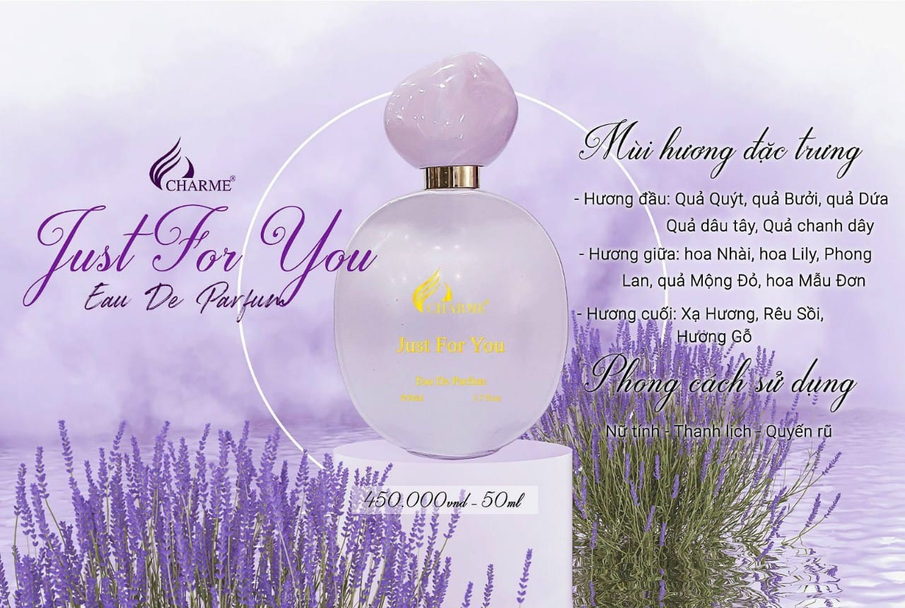 Nước hoa Charme Just For You bắt đầu lớp hương đầu tiên với làn sóng cam quýt bưởi, nho đen và hương hoa loa kèn ngọt ngào. Lớp hương giữa là hương các loài hoa ngọt ngào như ẩn chứa những bí mật thầm kín của các bạn nữ, tạo nên nét đáng yêu khiến đấng mày râu không ngừng tò mò. Lớp hương cuối, là hương cay nồng và thảo mộc mang lại nét đẹp đúng nghĩa của các quý cô.