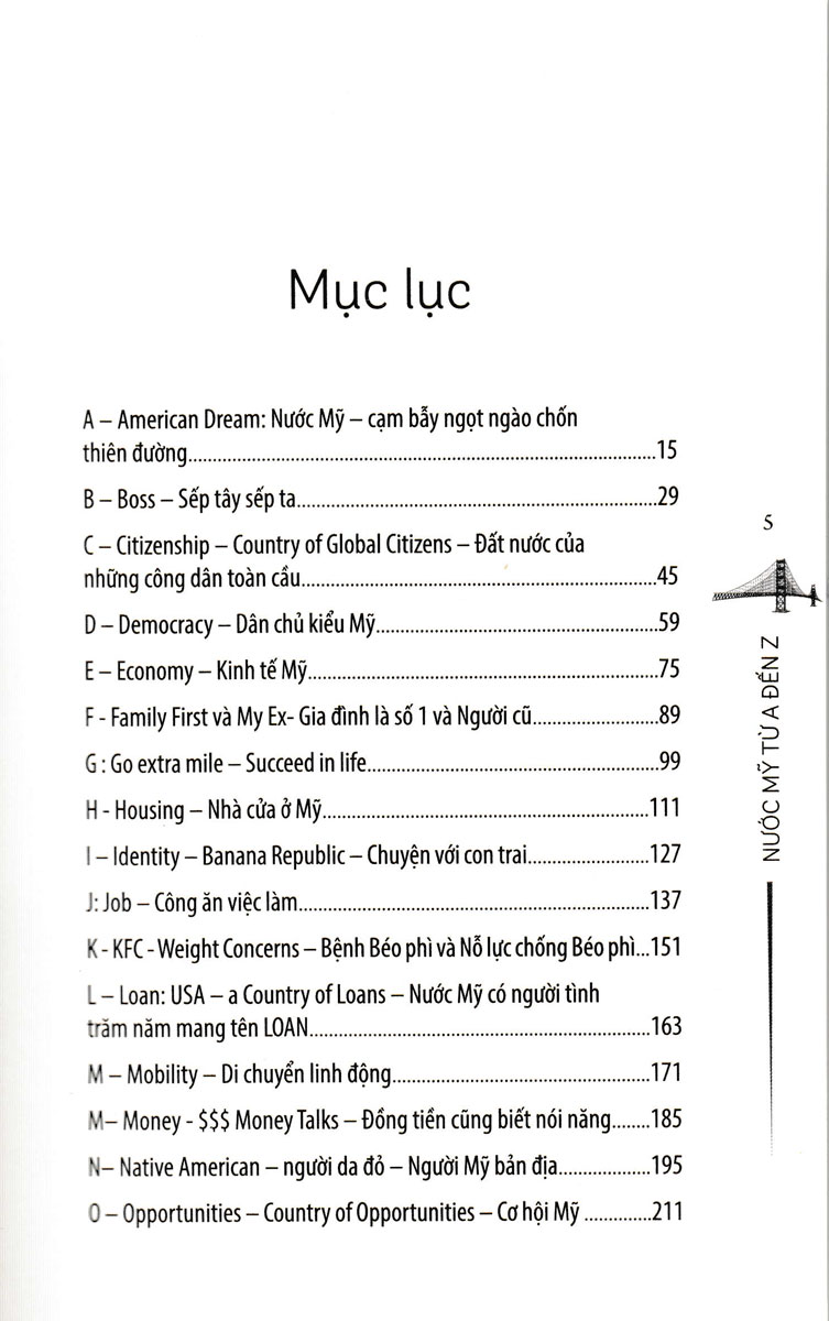 Nước Mỹ trong quan sát của tác giả Hiệu Minh không chỉ là những điều to lớn, vĩ đại khiến nhân loại phải công nhận như là quốc gia đầu tiên có người đặt chân lên Mặt trăng, quốc gia của những giải Nobel hay đất nước công nghệ số 1 mà đó còn là đất nước với “A-American Dream tưởng là giấc mơ Mỹ nhưng chỉ là giấc mơ trong mắt trẻ trâu với những trải nghiệm thật. Tương tự, tác giả nhìn ra Hoa Kỳ là cái Z-Zoo vì môi sinh được giữ gìn. S-Special Education nói về người cha đưa hai con nhỏ tới Mỹ, một con mắc chút tự kỷ, được nền giáo dục Mỹ yêu thương và hôm nay đưa con tới bến đậu của American Dream…”. Những chuyện yêu đương, hôn nhân, việc học, việc làm, việc kiếm tiền để sống ở quốc gia dân chủ thì rất dân chủ nhưng cũng vô cùng khắc nghiệt để tồn tại với những khoản nợ, những vụn vặt thuế khóa, rồi chuyện đến Tổng thống cũng phải bán nhà để chữa bệnh cho con… có thể sẽ khá bất ngờ với nhiều người.