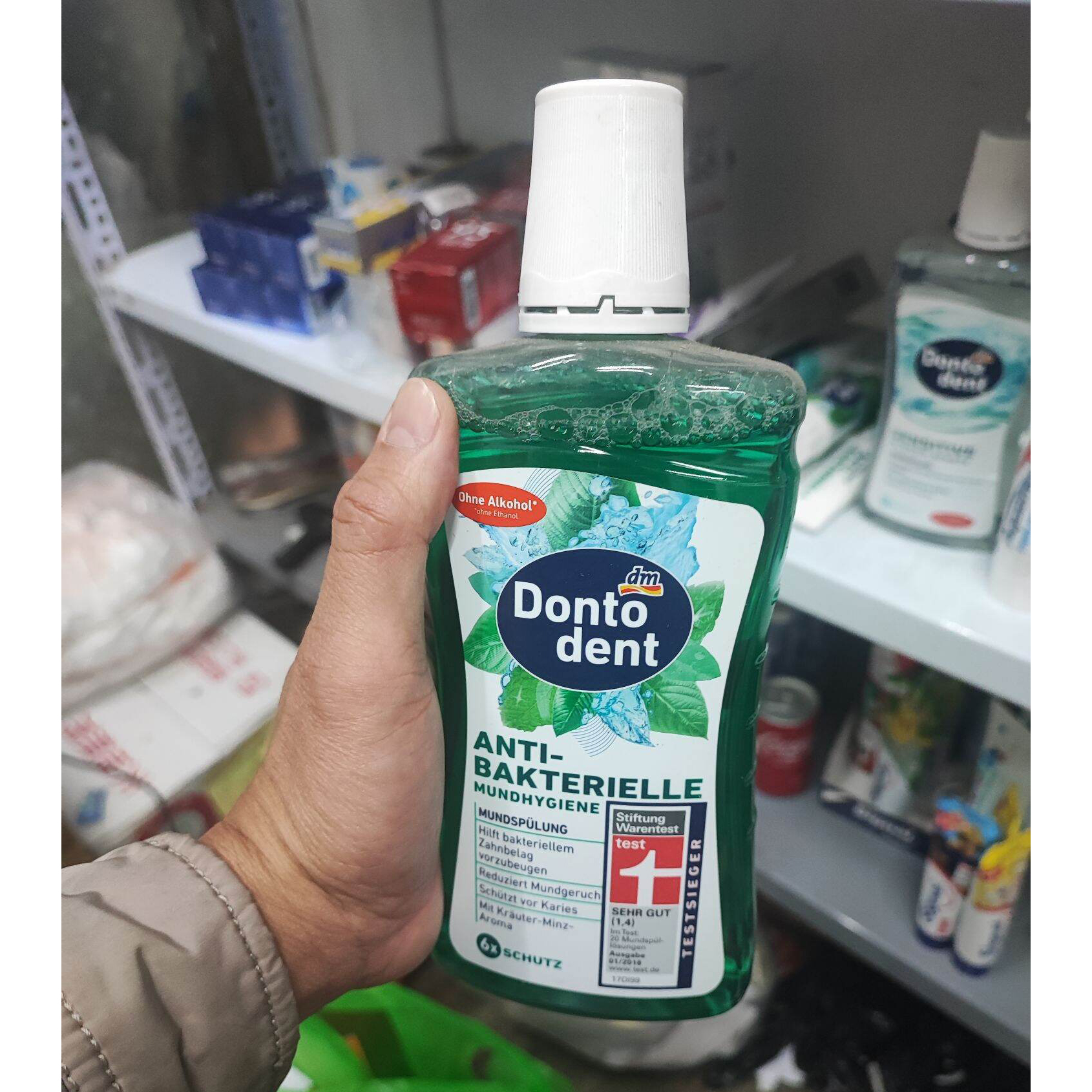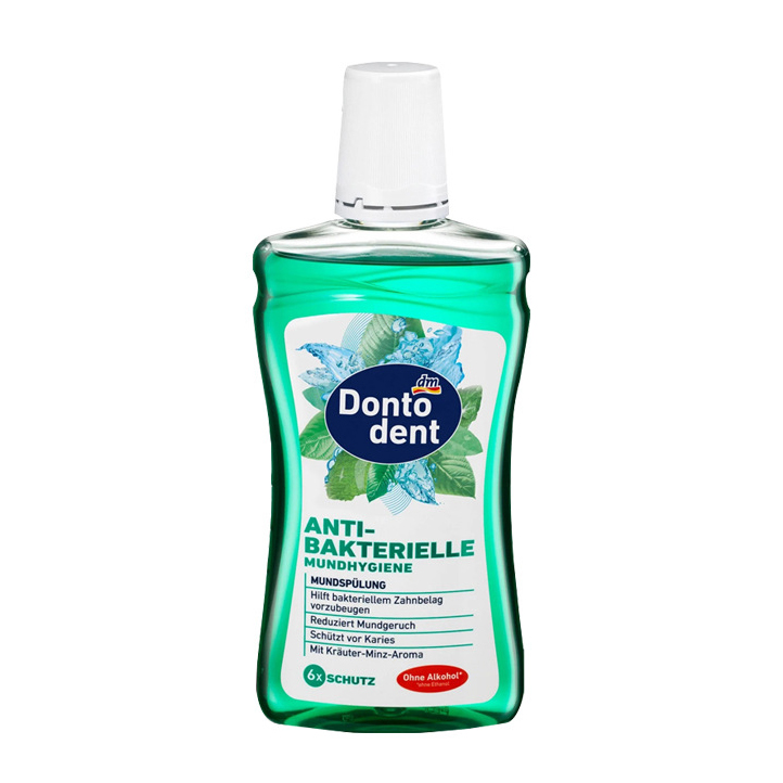 - Mang lại hơi thở thơm mát lâu dài. -Nước súc miệng vệ sinh răng miệng kháng khuẩn không chứa cồn Dontodent với công thức bảo vệ gấp 6 lần đảm bảo cảm giác miệng sạch sẽ, được chải chuốt toàn diện. Điều này sẽ hỗ trợ vệ sinh răng miệng kháng khuẩn của bạn một cách bền vững. *Không có etanol. Chứa natri florua: 450 ppm F-. **Lưu ý : Thích hợp để sử dụng hàng ngày. KHÔNG NUỐT! Thích hợp cho trẻ em từ 12 tuổi trở lên. Hướng dẫn sử dụng : Sau mỗi lần đánh răng, súc miệng bằng khoảng 2-4 nắp (tương đương khoảng 10-20 ml) nước súc miệng Dontodent không pha loãng trong 30 giây.