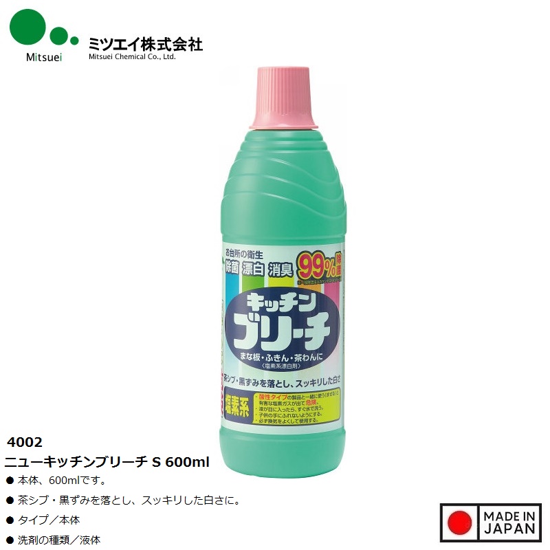 Nước tẩy đa năng nhà bếp Mitsuei Bleach 600ml ■ Xuất xứ: Nhật Bản | MADE IN JAPAN ■ NSX: Mitsuei Chemical Co., Ltd (Japan) ■ Model: 4002 ■ Kích thước: 24.1 x 7.5 x 7.5 cm ■ Màu