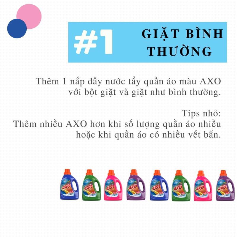 Nước Giặt Tẩy Quần Áo Màu AXO - Với công nghệ từ Philippines, AXO giúp tẩy sạch các vết bẩn trên quần áo màu như Cafe, Cari, dầu nhớt, vết mực, vết bút bi mà
