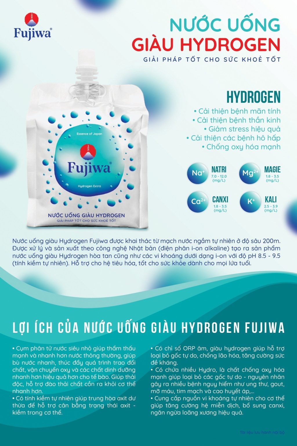 Mô tả Nước uống giàu Hydrogen Fujiwa được khai thác mạch nước ngầm tự nhiên độ sâu 200m, được xử lý và sản xuất theo công nghệ Nhật Bản (điện phân i-on Alkaline) tạo ra sản phẩm nước uống thành phần chính giàu Hydrogen hòa tan, chỉ số ORP âm, các vi khoáng dưới dạng i-on với độ pH 8.5 ~9 (tính kiềm tự nhiên), ĐẶC TÍNH