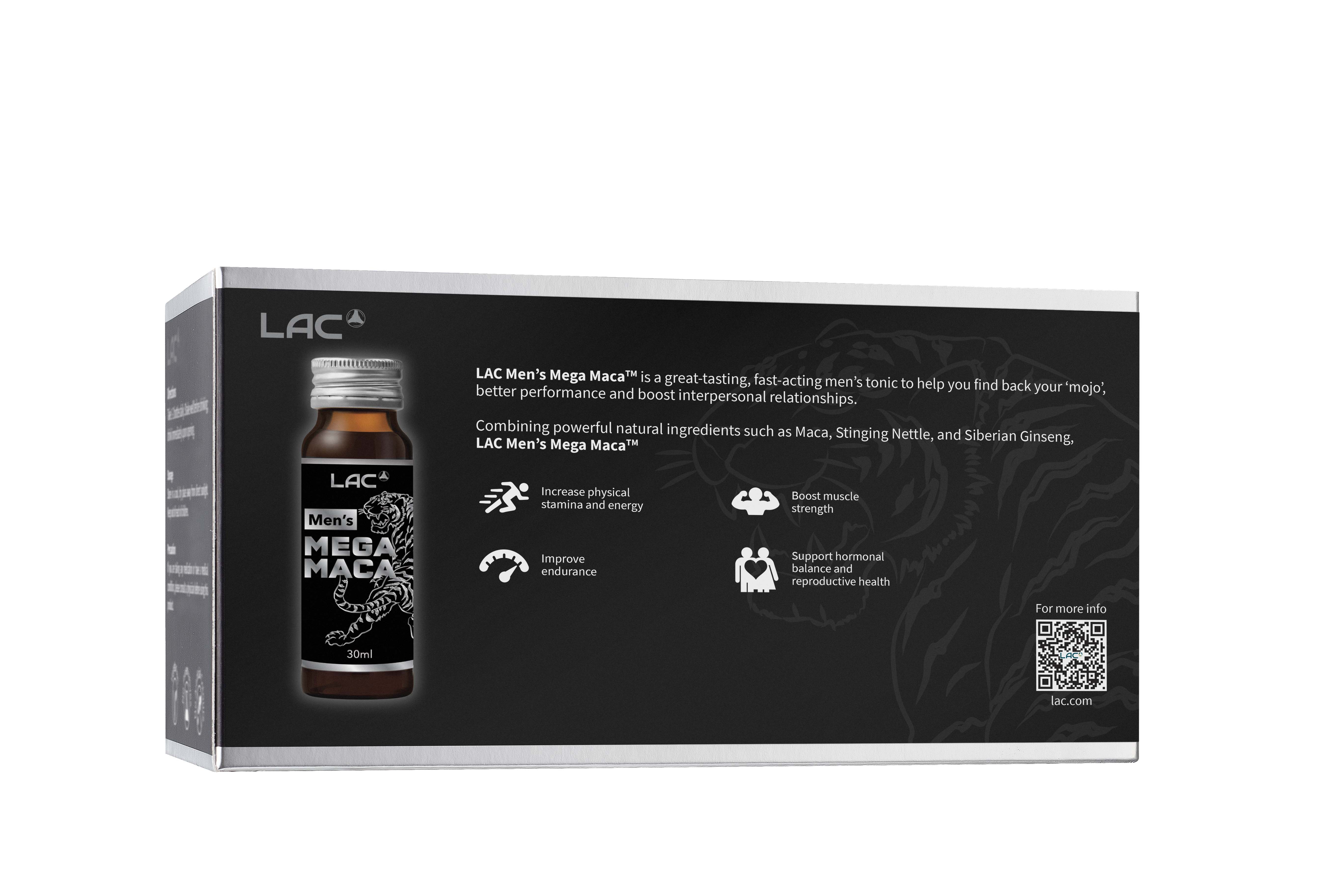NƯỚC UỐNG TĂNG CƯỜNG SỨC KHỎE, SINH LỰC VÀ THỂ TRẠNG DÀNH CHO NAM GIỚI LAC MEN'S MEGA MACA (30ML X 10 CHAI) là sản phẩm bổ trợ sức khỏe dành cho nam giới -